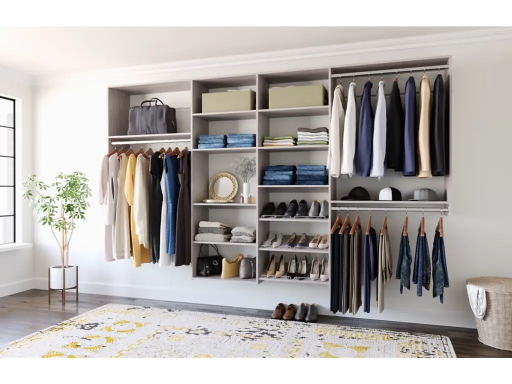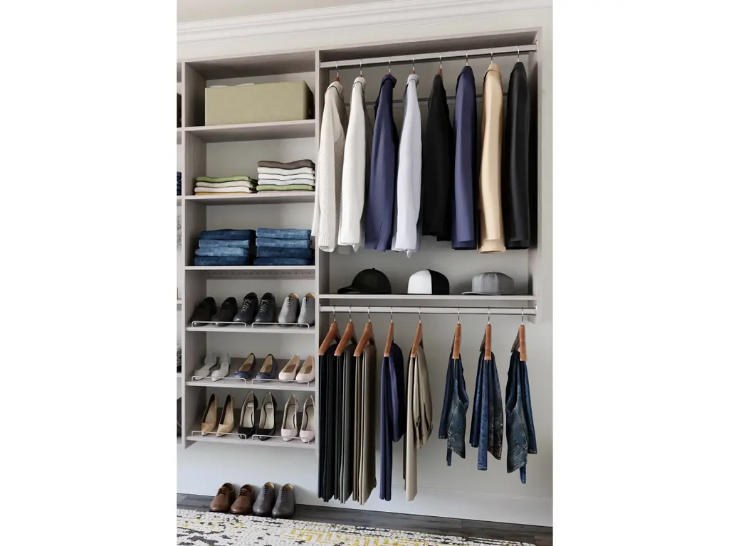 The 10 ft. Dual Tower Classic Kit is easy installation and organization from beginning to end. This box includes a kit that will meet everyday organization needs with open and adjustable shelving, slanted shoe storage and ample hanging space. Adjustable shelving stores stacks of sweaters, denim, bags, and more. Ample open shelving leaves room for personal touches and large bins to hold small items. Slanted shoe storage is designated space to keep favorite footwear off the floor. And hanging space offers quick access to shirts, dresses and slacks. For an easy install, the Dual Tower Classic Kit hangs on wall-mounted steel rails and comes with all of the required installation hardware. For any questions regarding this product, please contact customers@thestowcompany.com or 1-800-562-4257, Monday through Friday, 8:00AM to 5:00PM (EST).