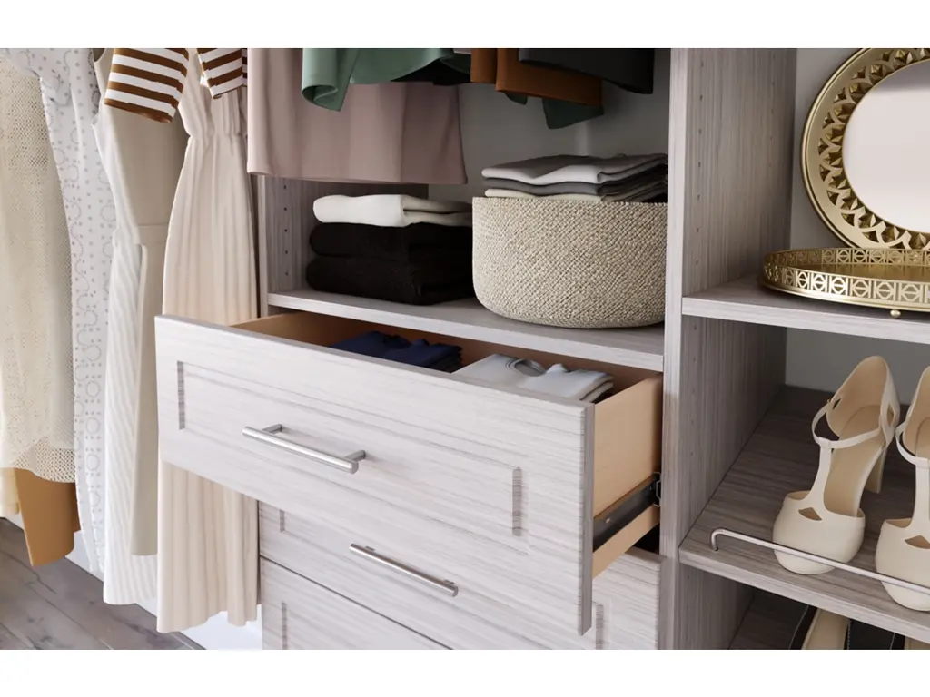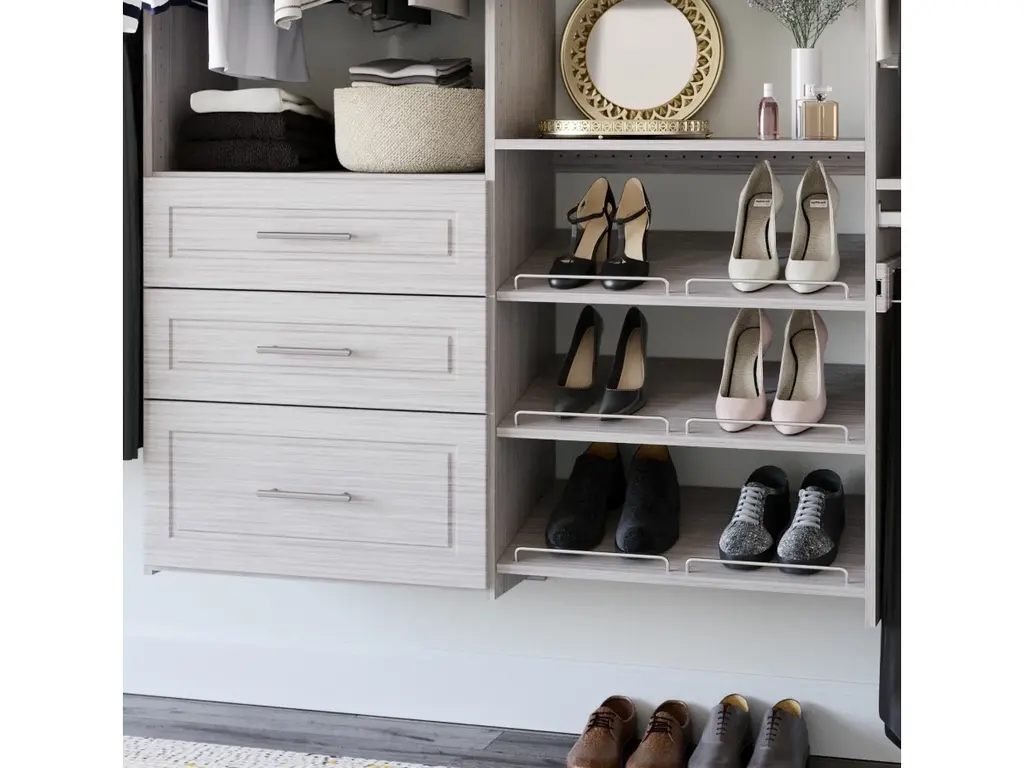 Organize your space with the Modern Raised Dual Tower Kit. This high-end closet kit offers a variety of storage solutions with up to 30 ft. of shelving and up to 9 ft. of cut-to-fit hanging storage. This unique design also includes space dedicated specifically for shoe storage, perfect for displaying your collection. Designed in four finish options, this kit ensures that your space is efficiently maximized, while elevating the overall look and feel of your closet. For any questions regarding this product, please contact customers@thestowcompany.com or 1-800-562-4257, Monday through Friday, 8:00AM to 5:00PM (EST).