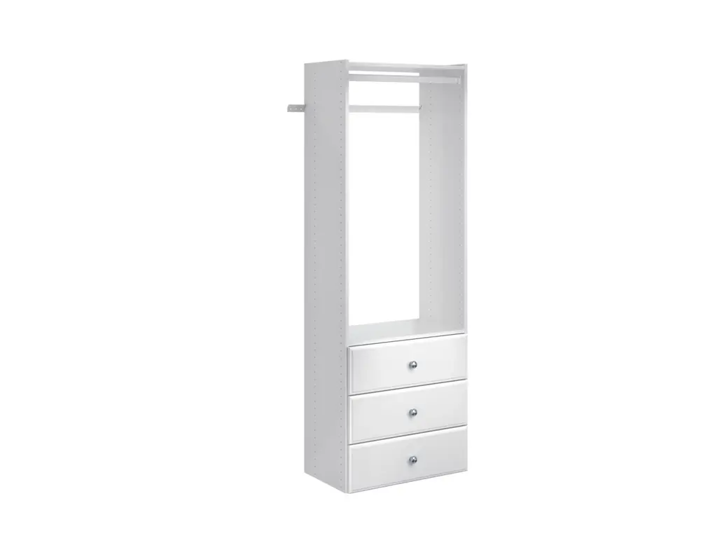 Get organized with the easy to install elite tower closet kit. Need hidden storage for folded items? The durable three drawers include stylish fronts, knobs and have full extension ball bearing glides. Need hanging space for your medium length clothing? The adjustable-height rod offers up to 24 in. of hanging space. This closet system hangs on a wall mounted steel rail for an easy installation. Each kit can be installed on its own or combined with other closet kits and comes with all of the required installation hardware. For any questions regarding this product, please contact customers@thestowcompany.com or 1-800-562-4257 Monday through Friday 8:00AM to 5:00PM (EST)