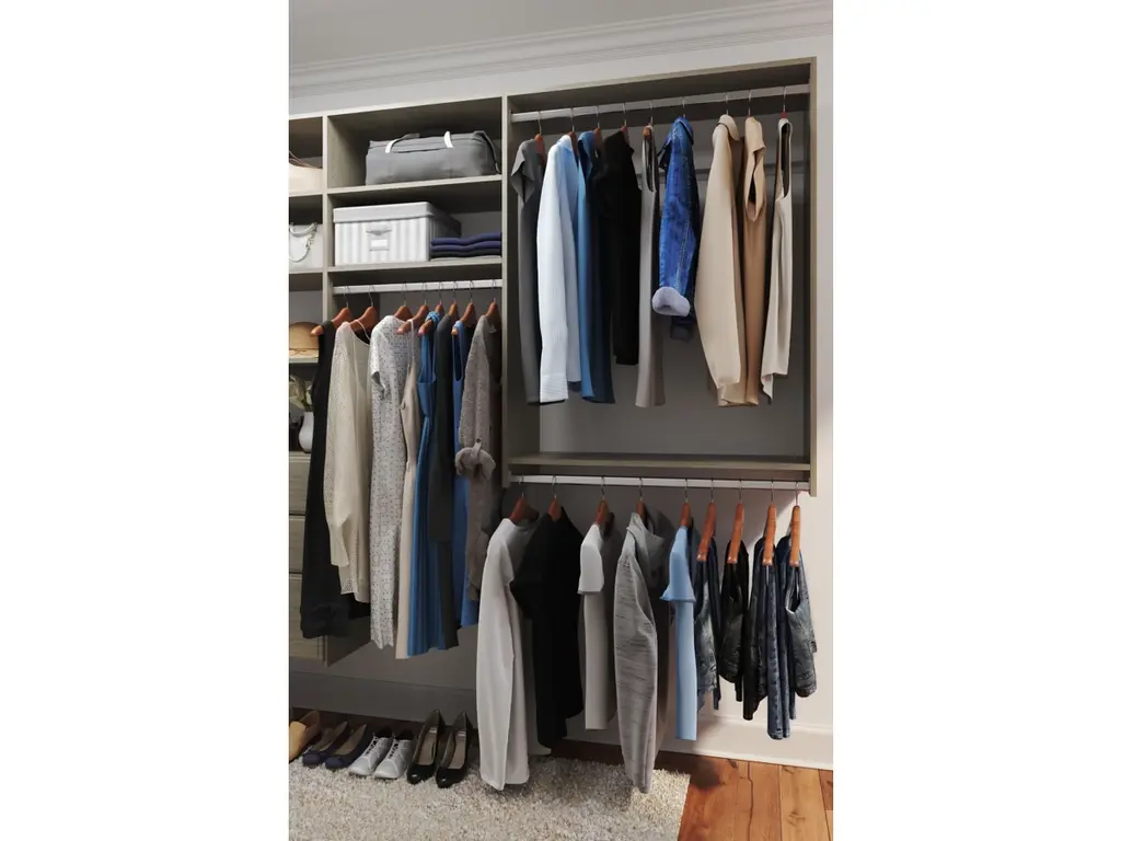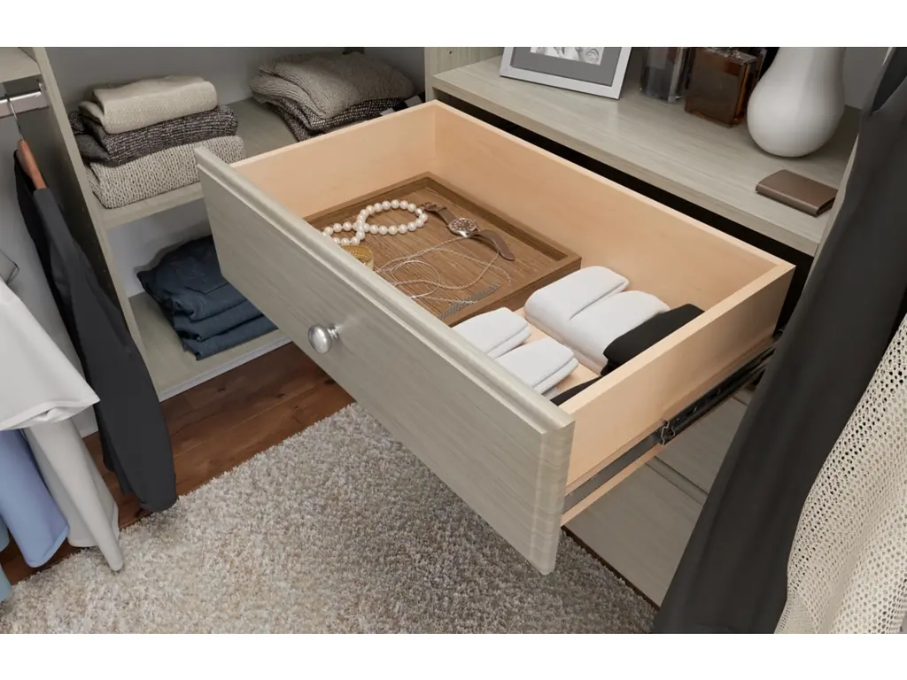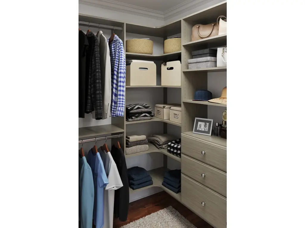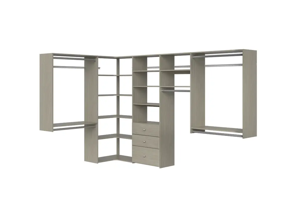 Get organized with this all-inclusive ultimate corner kit. This box includes everything you need to complete your closet which includes 49-ft of shelf space and 14-ft of hanging space. The kit comes with two 8” drawers and one 12” drawer with included knobs and full extension ball bearing glides. This closet system can be cut to fit your desired width and hangs on wall mounted steel rails for an easy installation. Each kit can be installed on its own or combined with other closet kits and comes with all of the required installation hardware. For any questions regarding this product, please contact customers@thestowcompany.com or 1-800-562-4257 Monday through Friday 8:00AM to 5:00PM (EST)