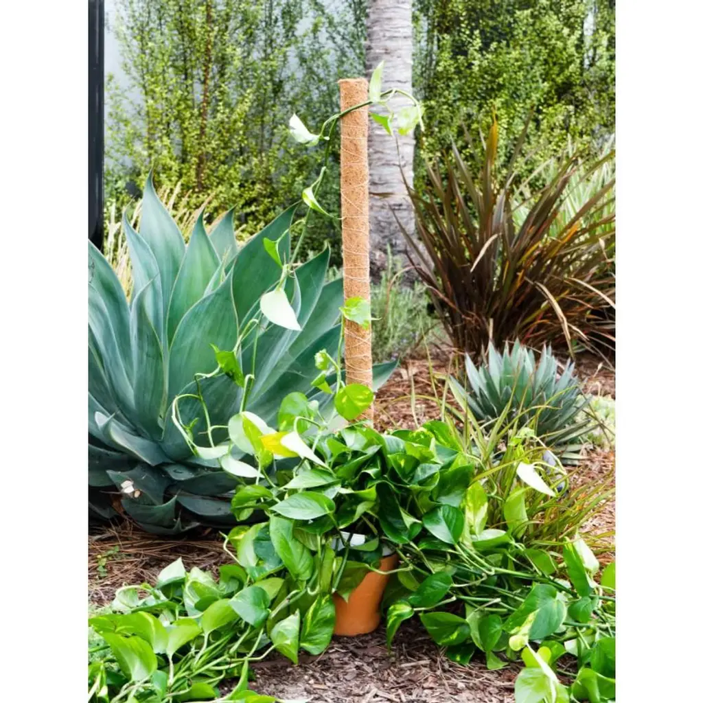 Coco moss poles are used to support climbing plants as they grow, such as Monstera, Money Plants, Philodendrons, Pothos and other vines. Made from natural coconut fiber and wood, these sustainable plant poles are an earth friendly addition to the garden soil of your climbing houseplants, promoting healthy plant growth and strong roots. Each coco coir pole is 36 inches tall and comes in a pack of 12. To use, insert the wood plant stake into the garden soil of the planter pot, wrap the climbing plant around the coco coir pole and tie in place with a natural twine or twist ties (not included). Add another coco pole as your epiphytic plant grows taller to easily extend the height of the moss totem pole.