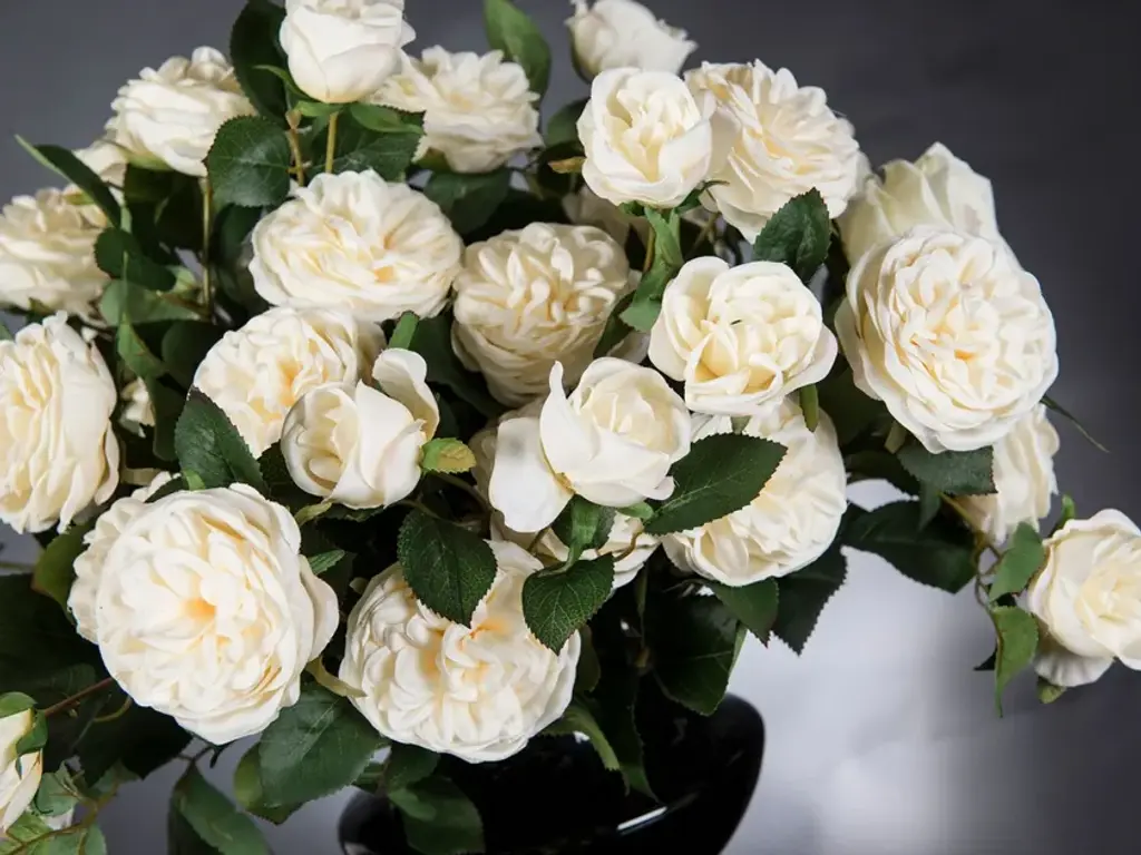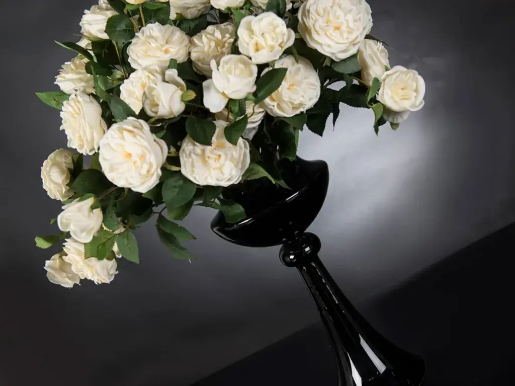 ERACLE BOUQUET is a faux flower arrangement in black glass vase with artificial flowers and “water illusion”, created by our floral designers. Ideal for interior decor or weddings and events setting.