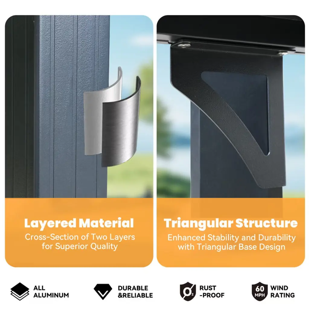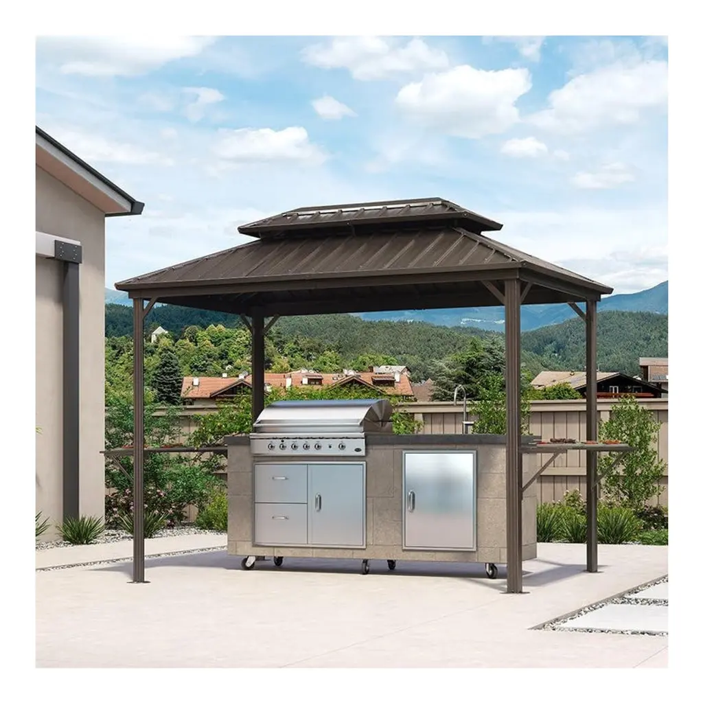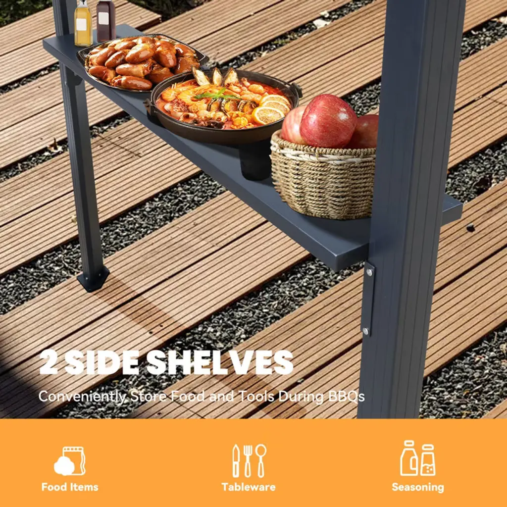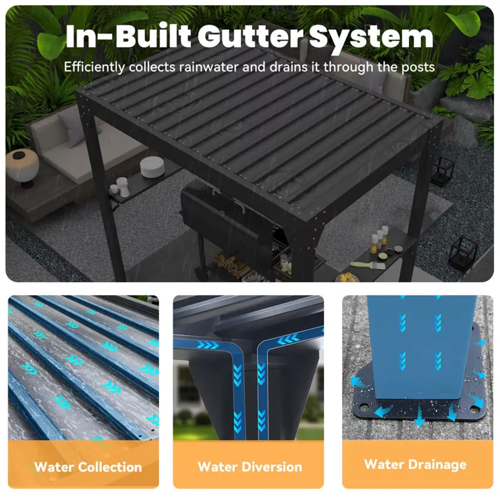 If you're an outdoor BBQ enthusiast, this louvered-top outdoor grill gazebo is your ideal choice. Constructed with a durable and heat-insulating aluminum frame, it effortlessly creates the perfect outdoor BBQ space. With its unique louvered roof design, you can control sunlight, benefit from superior rain protection, and effectively vent BBQ smoke. The built-in gutter system prevents roof water accumulation, extending the gazebo's functionality and lifespan—no weather can stop your BBQ gatherings. Additionally, convenient side panels are integrated into the grill canopy for outdoor grill, providing space to store utensils and BBQ accessories.