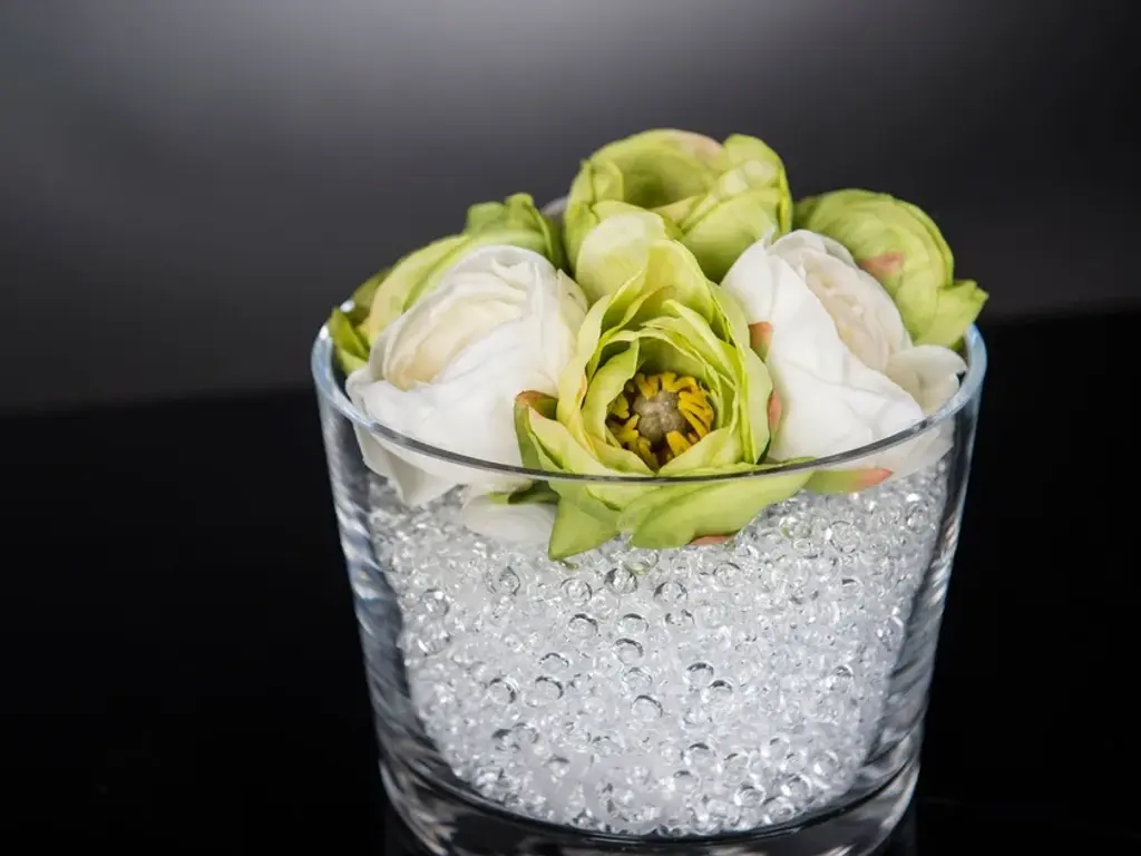 ETERNITY ALFEO RANUNCOLO MIX is a faux flower arrangement in clear glass vase with ranunculus, artificial gems and “water illusion”, created by our floral designers. Ideal for interior decor or weddings and events setting.