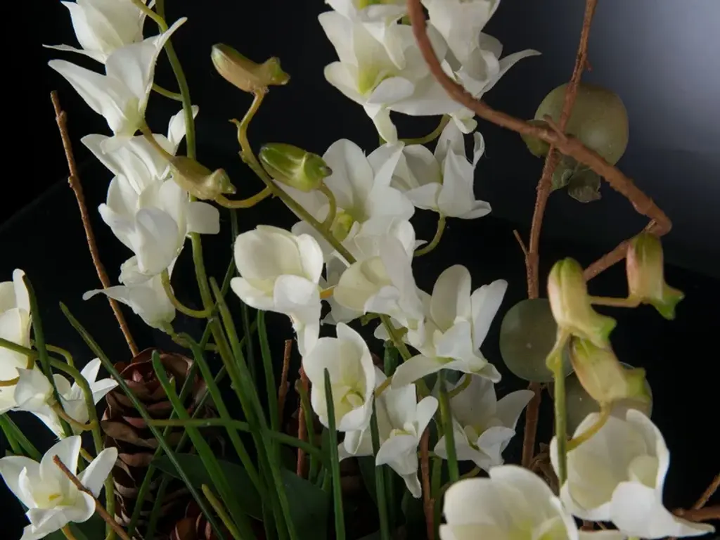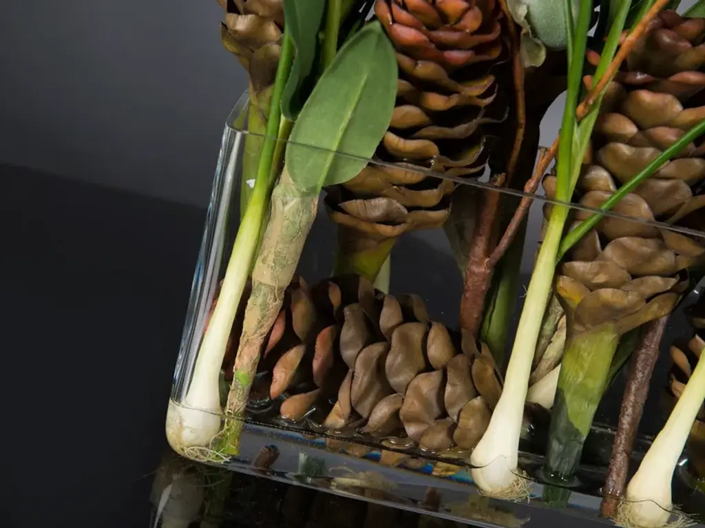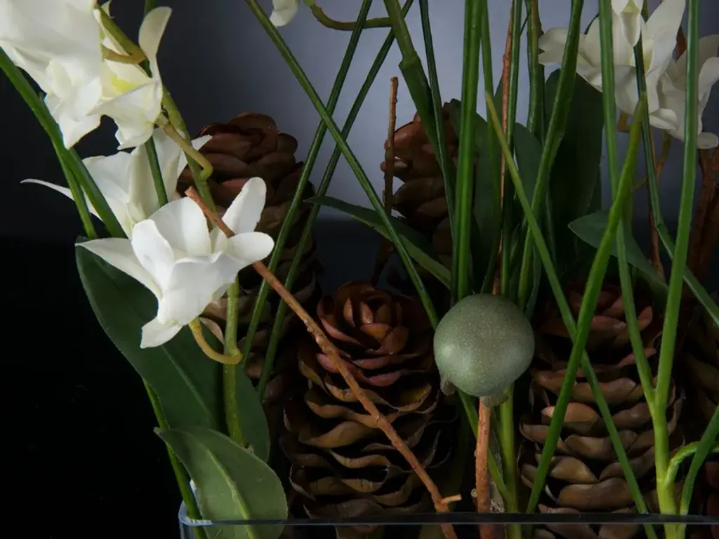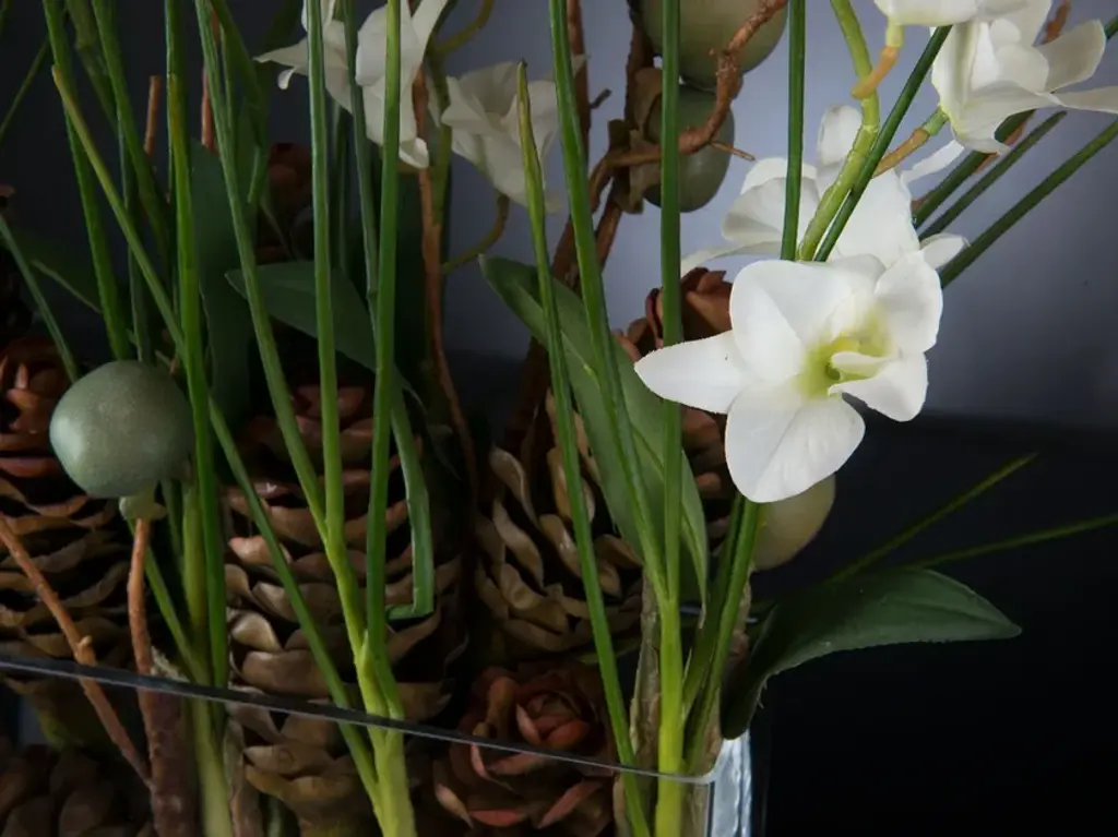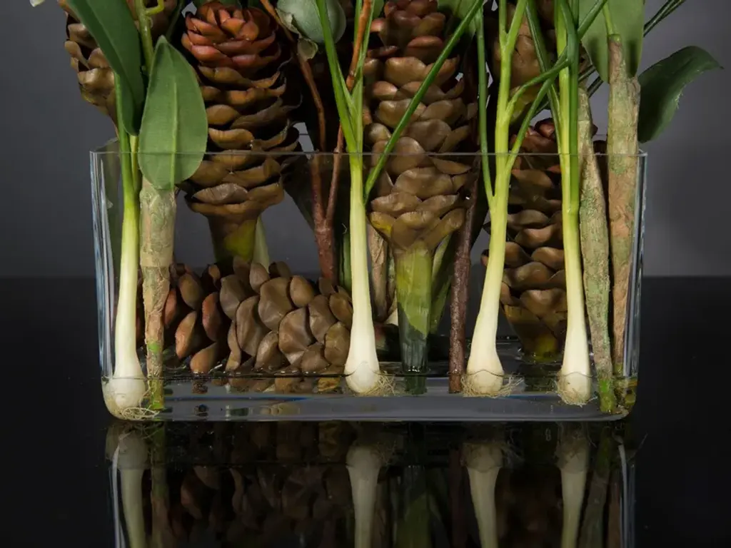ETERNITY RECTANGULAR VASE CORINTO is a faux flower arrangement in clear glass vase with artificial flowers and “water illusion”, created by our floral designers. Ideal for interior decor or weddings and events setting.