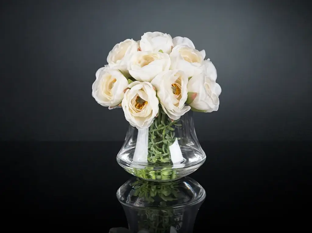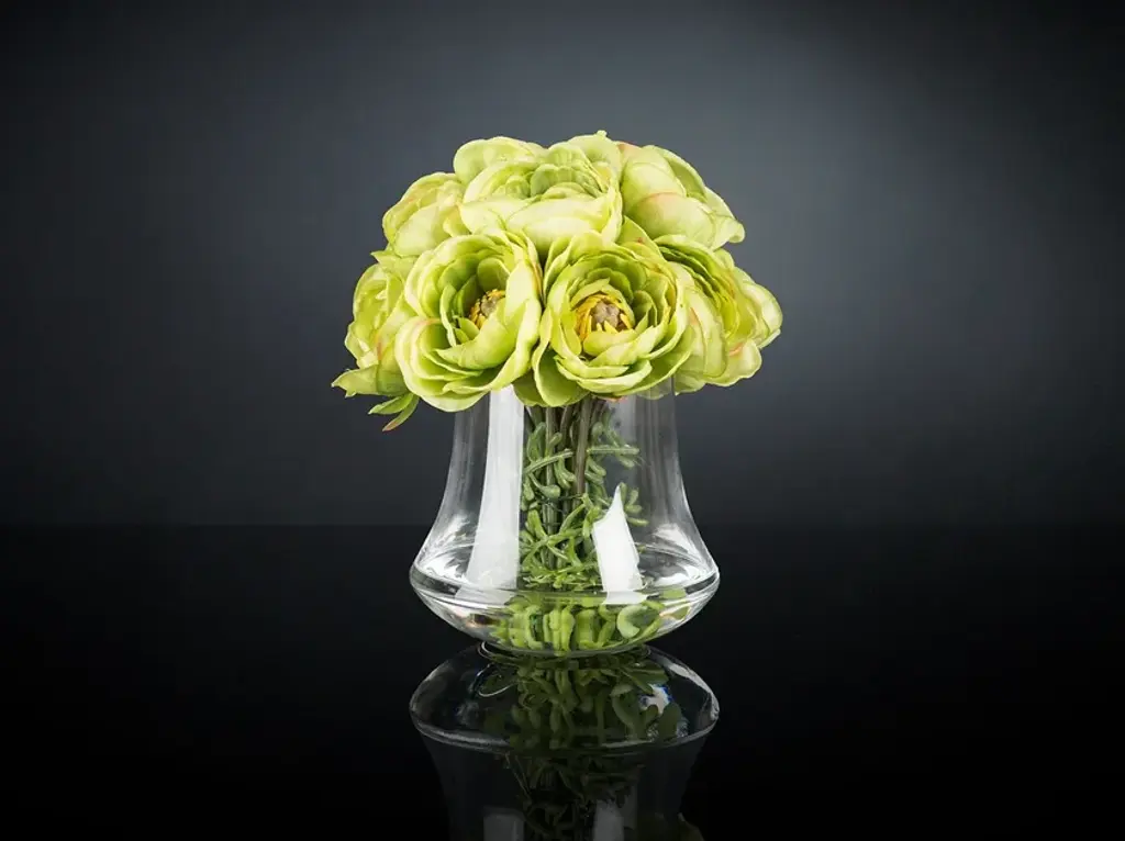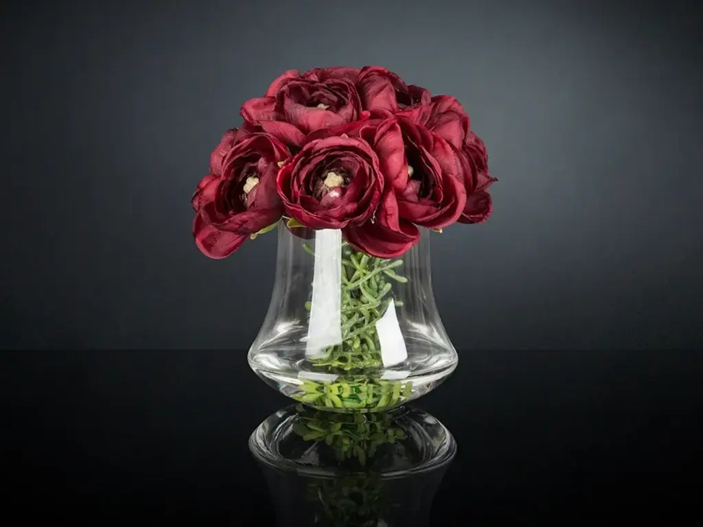 ETERNITY MINIMES RANUNCOLO BOUQUET is a faux flower arrangement in clear glass stand with artificial flowers and “water illusion”, created by our floral designers. Ideal for interior decor or weddings and events setting.