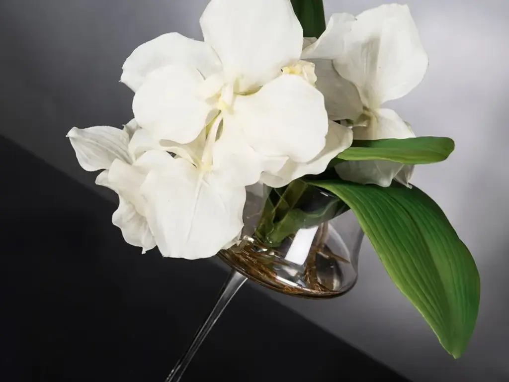 ETERNITY MINIMES VANDA is a faux flower arrangement in clear glass vase with artificial flowers and “water illusion”, created by our floral designers. Ideal for interior decor or weddings and events setting.