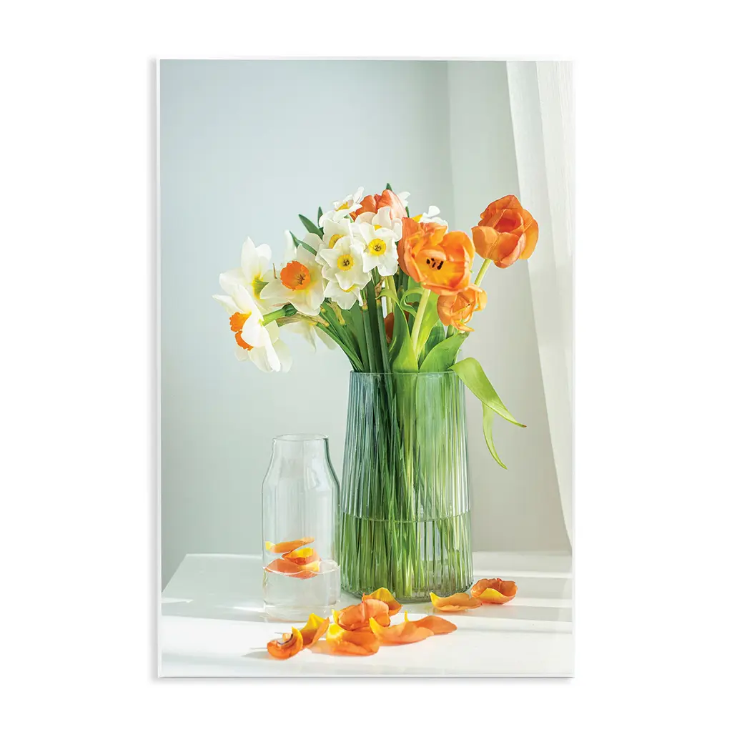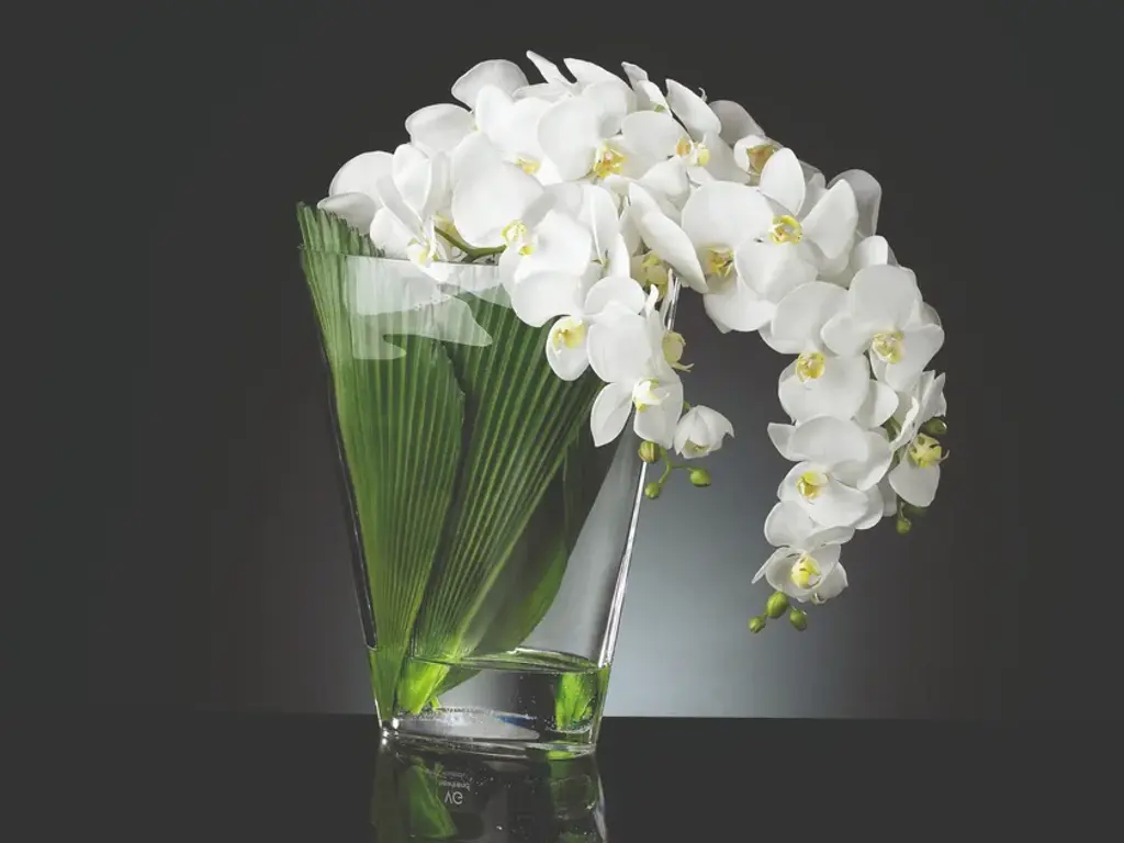 ETERNITY VANDA CASCADES is an artificial flower arrangement in clear glass vase with faux flowers, created by floral designers. Ideal for interior decor or weddings and events setting.