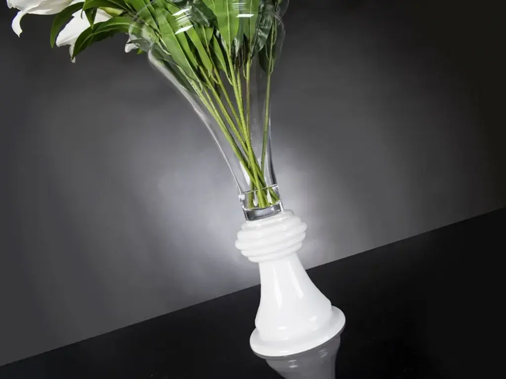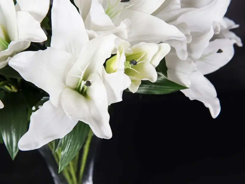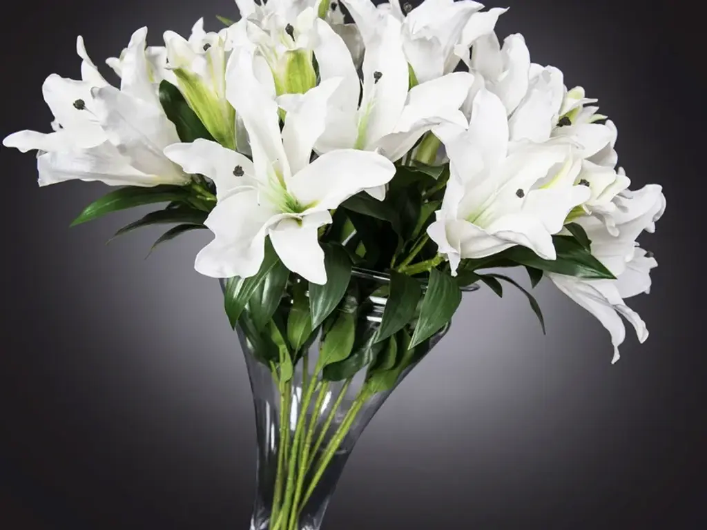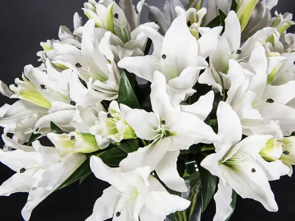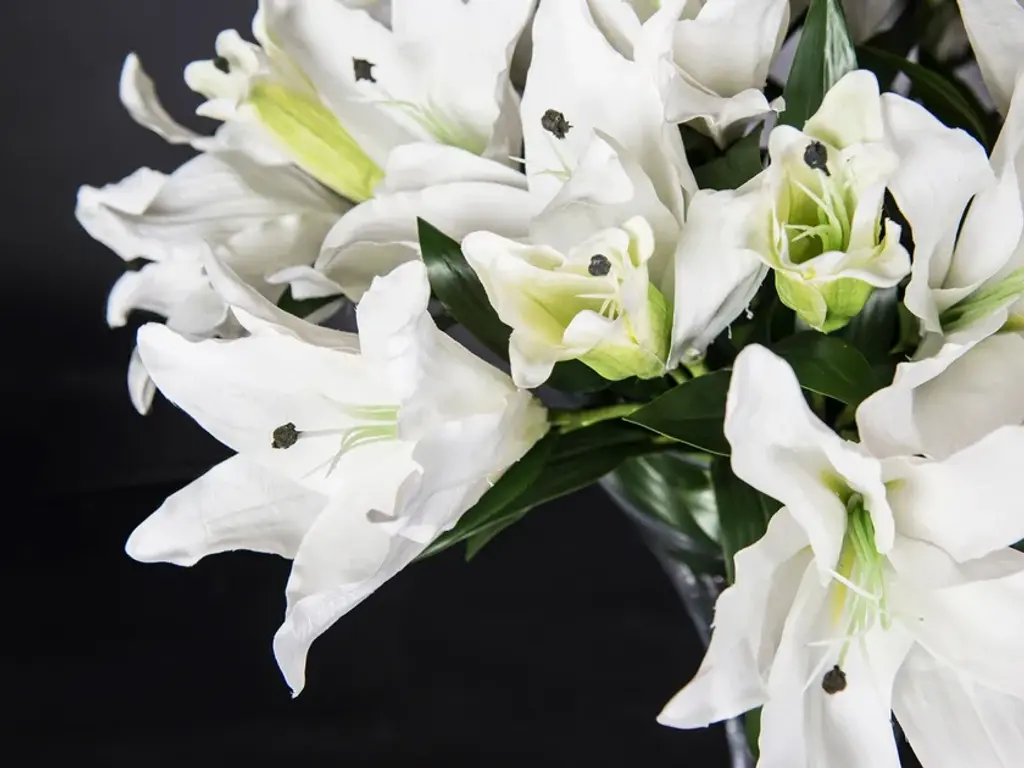 ETERNITY - VANESSA LILIUM is a faux flower arrangement in clear glass vase with artificial flowers and “water illusion”, created by our floral designers. Ideal for interior decor or weddings and events setting.