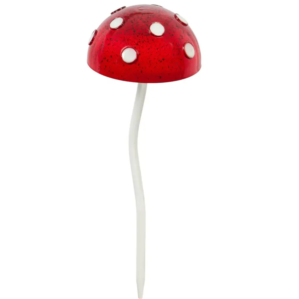 Give your outdoor space a whimsical touch come nightfall with this Glow in the Dark Mushroom Plant Pick. This design features a vibrant blue mushroom with glowing white polka dots that bring the design to life. Perfect for spring and summer, neighbors and guests will love this gorgeous garden accent after the sunsets. Made of durable metal, you can be sure this decor will last season after season. A great addition to a night garden, this plant pick has a white arrow stake for easy insertion and display. This mushroom plant pick also makes a great gift for a family member or loved one.