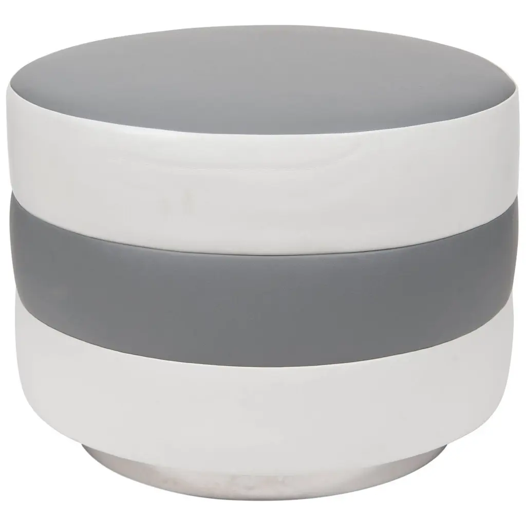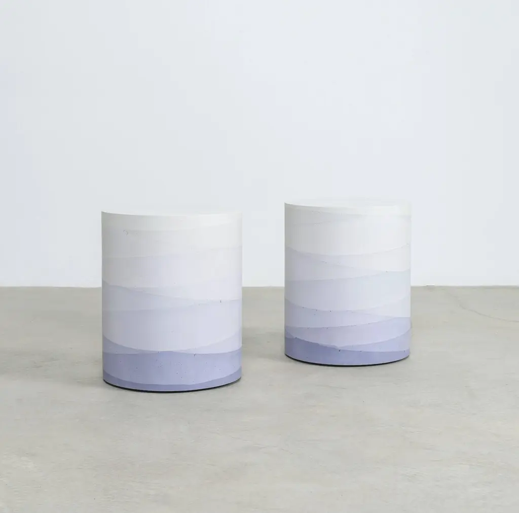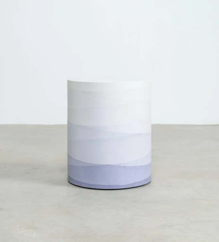 An exploration in the softness and subtly of the materials, the made-to-order drum has a hollow cavity and is cast entirely from hand-dyed cement. Poured in individual hand-dyed layers, starting from the base color lavender and fading to white, the simple geometric form creates a light ombre effect reminiscent of watercolor. The pieces have hollow cavity and weigh approximately 40lbs.