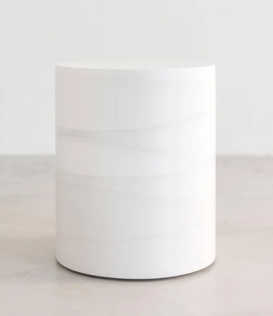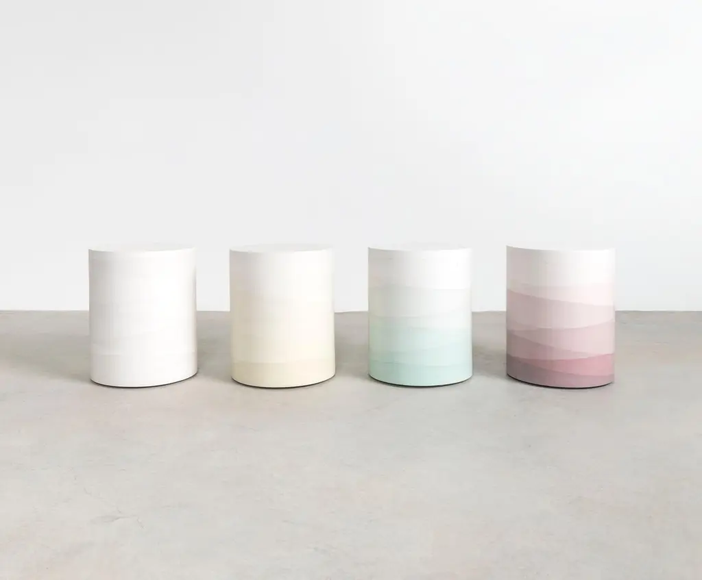 An exploration in the softness and subtly of the materials, the made-to-order drum has a hollow cavity and is cast entirely from hand-dyed cement. Poured in individual hand-dyed layers of white cement, the simple geometric form creates a light ombre effect reminiscent of watercolor. The pieces have hollow cavity and weigh approximately 40lbs.