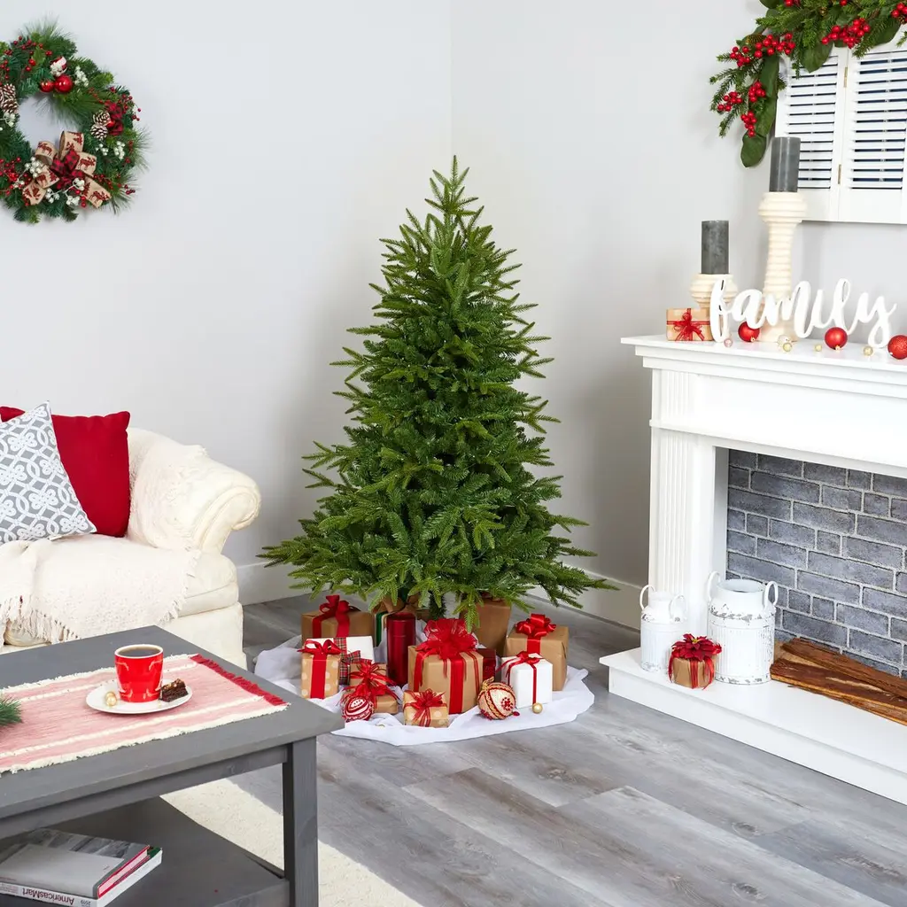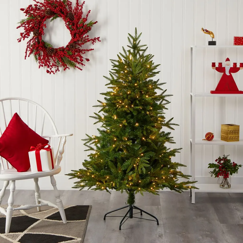 No tangled lights, no shedding needles: This faux fir is the Christmas tree that keeps on giving. Five feet high in its stabilized metal stand, the tree is prestrung with 250 clear LED lights among its bendable branches to complement any ornaments you hang on it.
