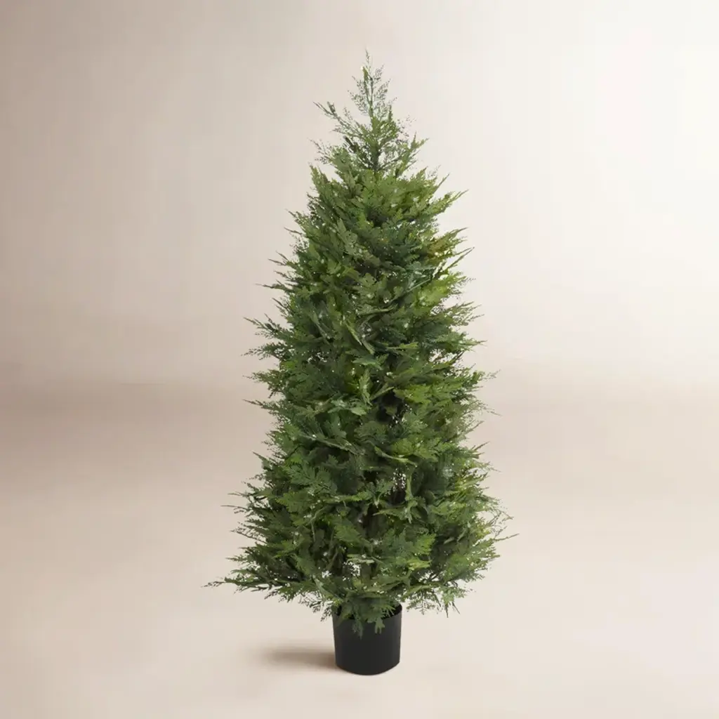 Less than two feet in diameter and four-and-a-half feet high in its black planter, this faux pine tree will bring festive spirit to even narrow niches. Its 250 bendable branches, modeled after natural cuttings, are prestrung with 100 white lights for fuss-free illumination.