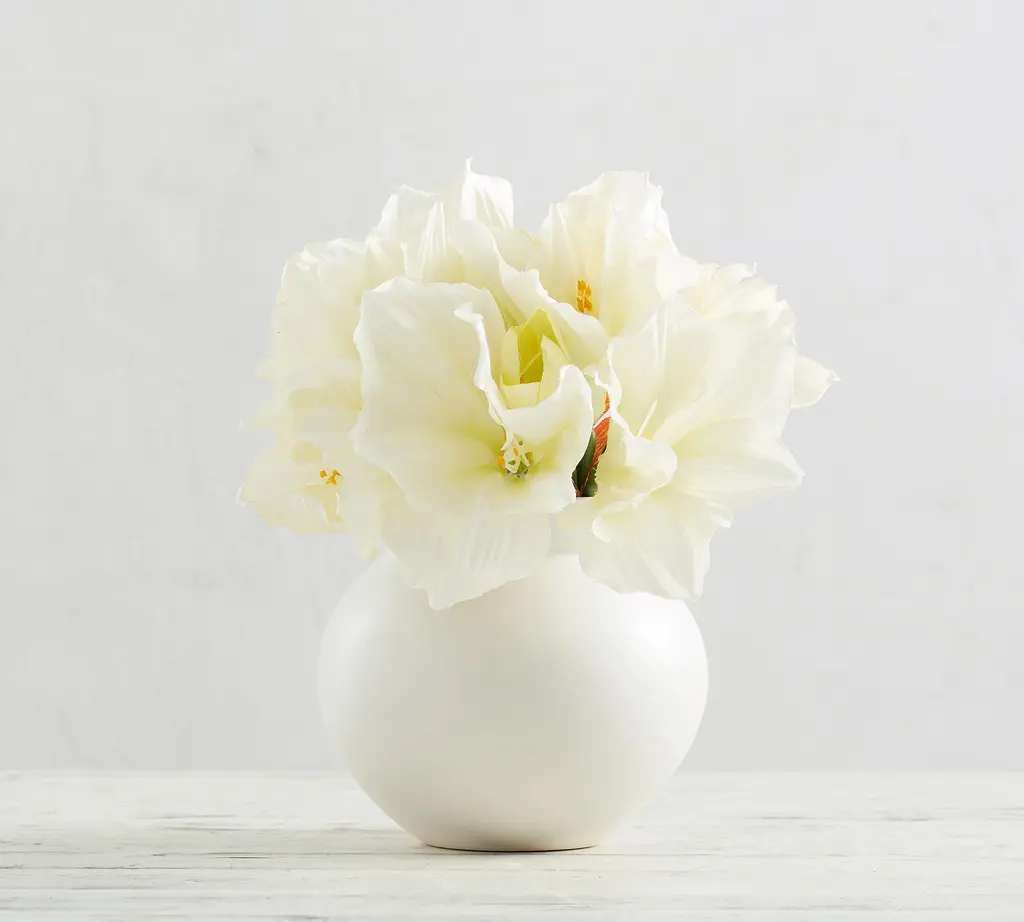 A favorite for brightening up those long winter days, amaryllis is a holiday classic. Handcrafted with softly ruffled petals and delicate shading, our faux bouquet closely resembles the vibrant beauty of live flowers.