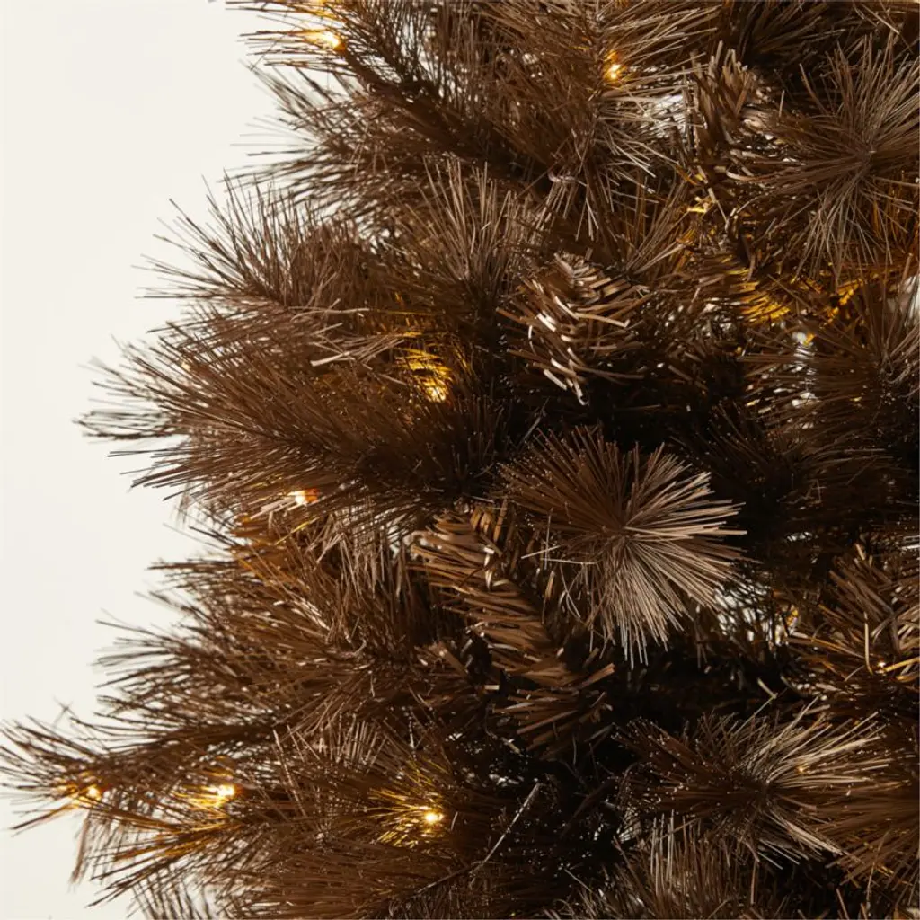 Boughs of bronze offer a bold, modern take on the traditional Christmas tree. Pre-lit with warm white LED lights, faux pine tree features adjustable branches for elegant ornament placement. Pair with the faux bronze pine wreath and stem. CB2 exclusive.