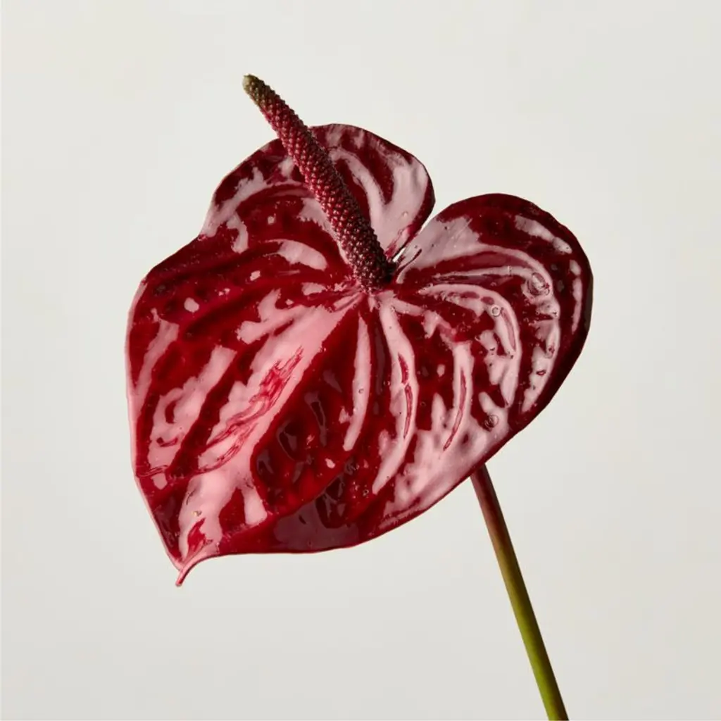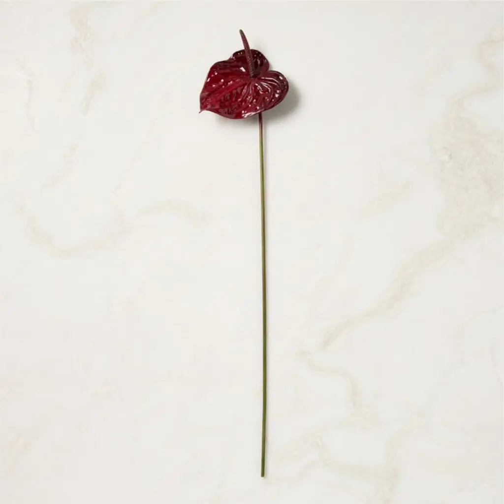 A tropical favorite, faux anthurium stem looks fresh all year long. Designed to capture the rich vibrancy of the real thing, each heart-shaped flower is carefully crafted for a lifelike appearance with a high-gloss deep burgundy finish. Supported on a slim, bendable stem, the bloom adds a pop of color to both holiday and year-round arrangements. CB2 exclusive.