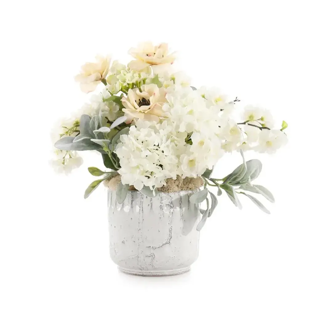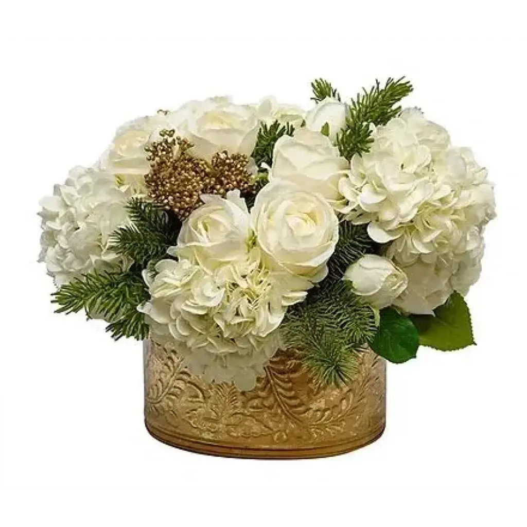 Just pop this pre-assembled bouquet made of lifelike blooms in a vase for an instant refresh to your holiday decor. This festive arrangement includes a bundle of evergreen stems, off-white blooms and a sprig of white berries combined with two Real Touch viburnum stems that show off clusters of tiny white green flowers with glossy dark-green foliage.