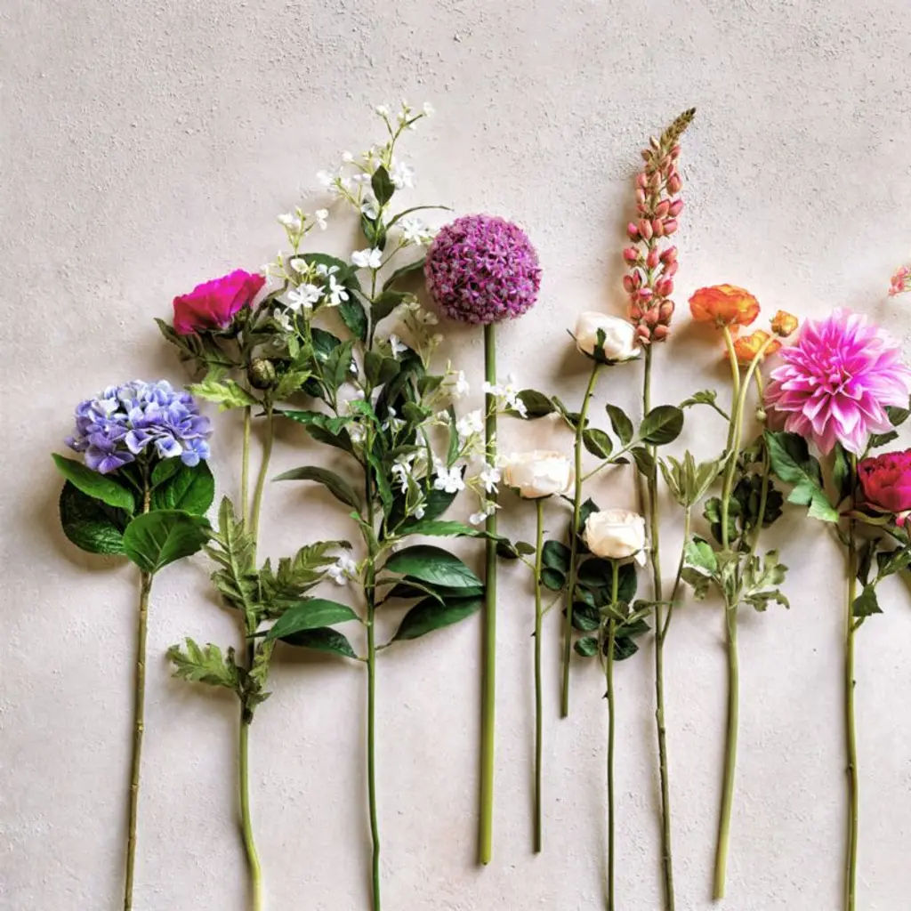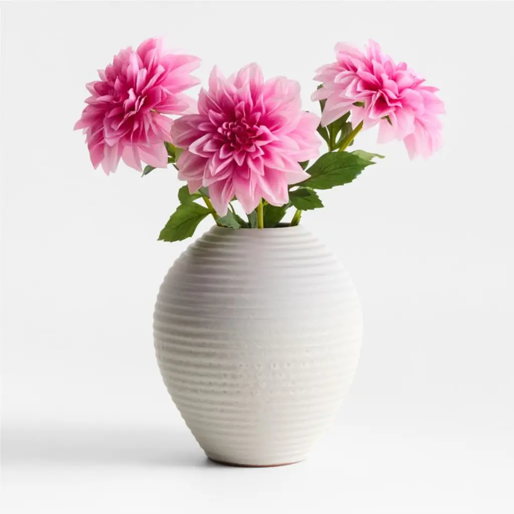Skillfully crafted to look like real flowers, our faux stems keep the fresh vibe alive all year long. The dahlia stem showcases a single, many-petaled pink blossom with each petal showcasing a tonal transition from dark magenta to pale pink. The flower's signature serrated leaves and tiny nodules on the graceful stem add even more realism to these fool-the-eye botanicals. Alone, in a cluster or mingled among other faux blooms, the dahlia stem brightens the room with its bright color and summery appeal.