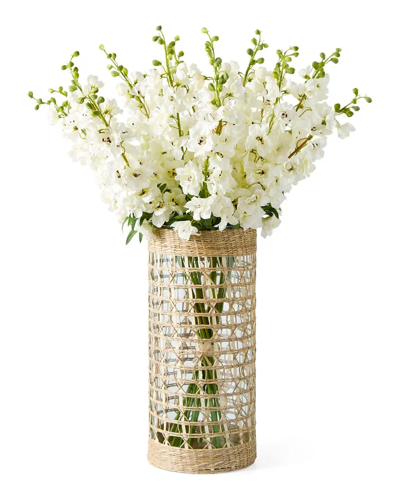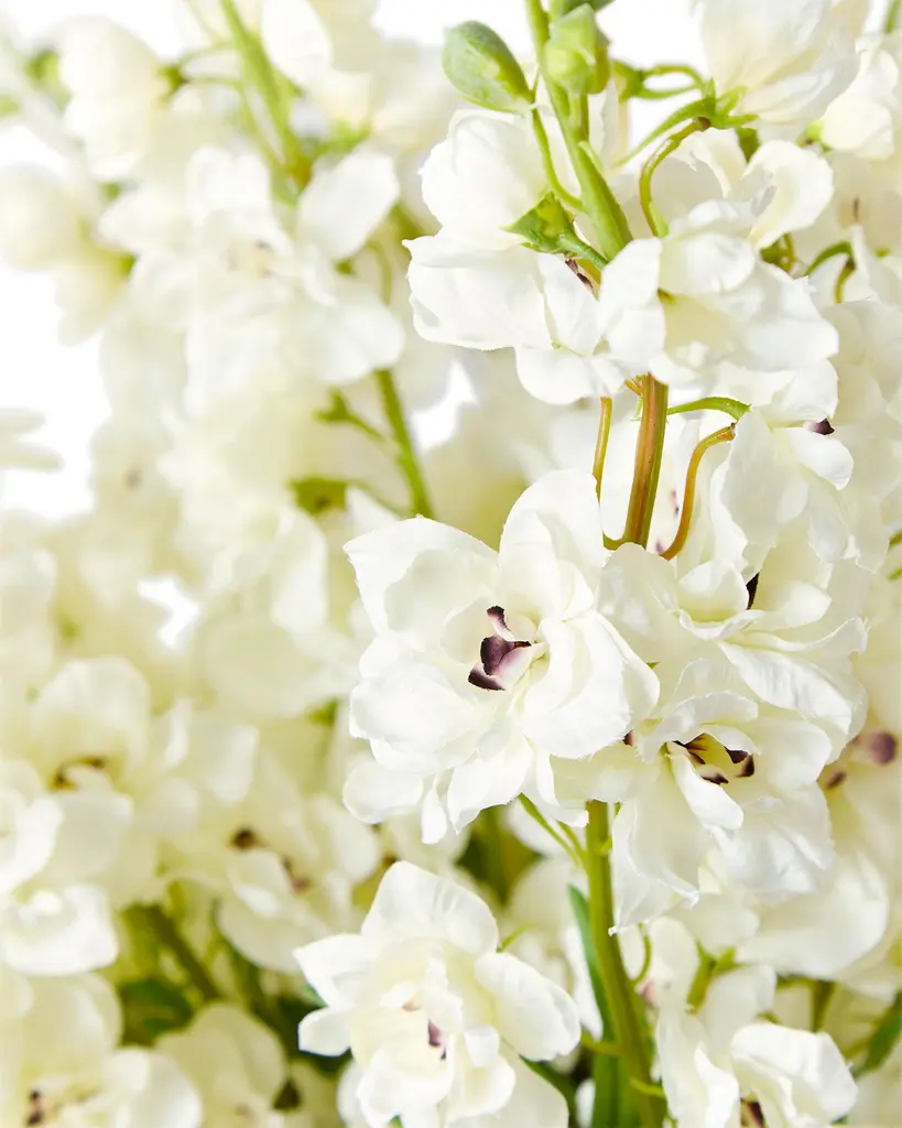 Stems. Our partnership with the doyenne of faux floral couture, Diane James, is in full bloom. Fashioned of fabric hued to emulate nature in her Connecticut studio, handmade delphiniums are grown to fit and flourish in our Cayman vessel.