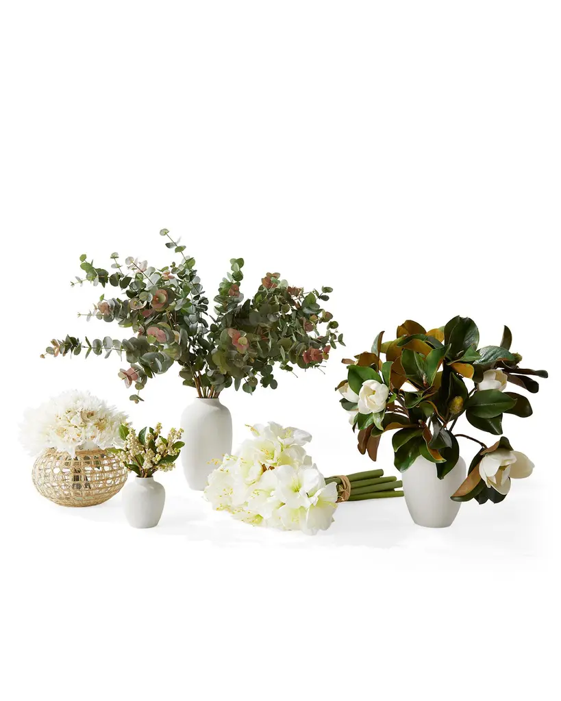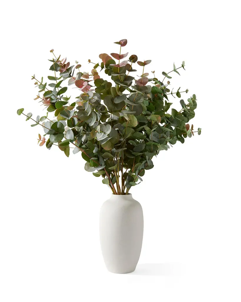 Stems. Our partnership with the doyenne of faux floral couture, Diane James, is in full bloom. Fashioned of fabric hued to emulate nature in her Connecticut studio, handmade eucalyptus are grown to fit and flourish in our Morro vase.