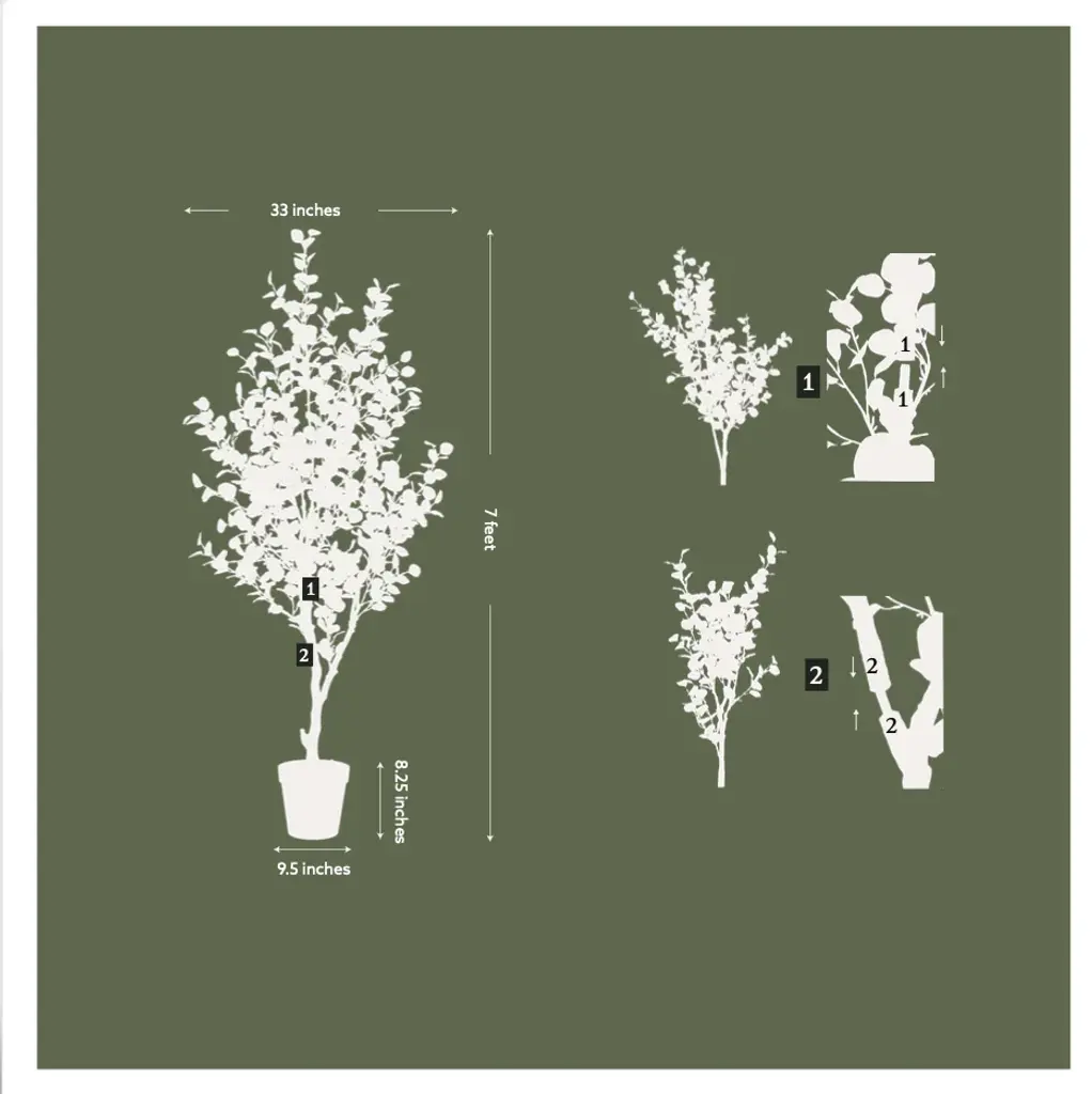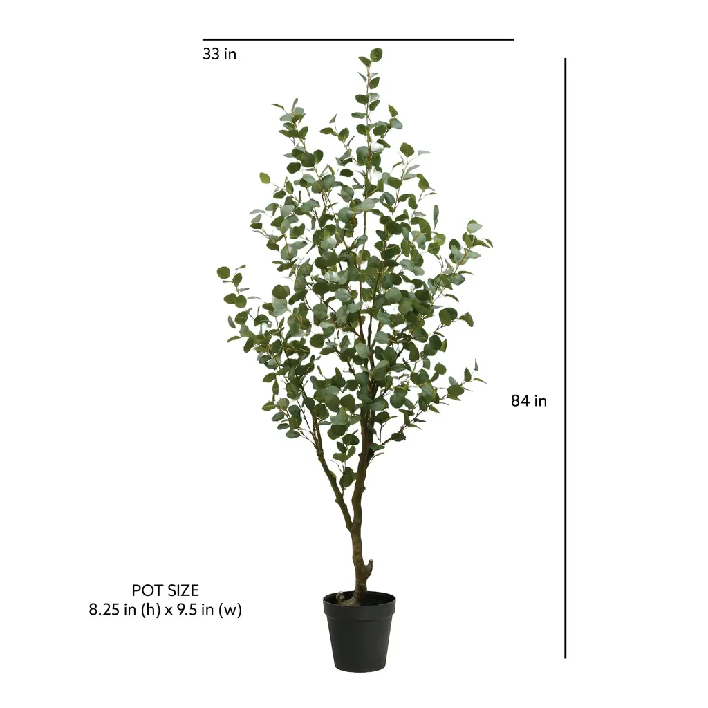 Elevate your living space with the timeless elegance of nature-inspired decor. Our meticulously crafted Artificial Eucalyptus Tree stands 7 feet tall and comes nestled in a sleek black 9.5" nursery planter, creating a stunning focal point that effortlessly complements any interior design. Our lifelike Eucalyptus Tree boasts meticulously designed leaves that mimic the intricate details and texture of real eucalyptus foliage. The deep, rich black grower pot adds a touch of modern sophistication, making it a versatile addition to various aesthetics - from minimalist chic to contemporary opulence. Crafted with precision and designed to perfection, this Artificial Eucalyptus Tree exudes an aura of perpetual freshness, enhancing the ambiance of any room. Its realistic appearance is bound to captivate your guests and evoke a sense of tranquility. Place it in your living room, office, or entryway, and watch as it transforms the space into a soothing oasis of natural beauty. The maintenance-free aspect of our Artificial Eucalyptus Tree is a true game-changer. Say goodbye to the hassle of watering, pruning, and dealing with pesky insects. With this lifelike alternative, you can enjoy the charm of nature without the need for ongoing care. Plus, its sturdy construction ensures longevity, allowing you to relish its allure for years to come. Whether you're a design aficionado or a busy professional, the Artificial Eucalyptus Tree offers an ideal solution to infuse life into your surroundings without compromising on style. The 7-foot height commands attention and fills vertical spaces with grace, while the black grower pot adds a bold touch that accentuates the tree's elegance. Incorporate the Artificial Eucalyptus Tree 7' in Black 9.5" Grower Pot into your interior decor and experience the enchantment of nature, minus the upkeep. Elevate your space with a touch of verdant beauty that radiates sophistication. Explore our collection today and discover the perfect harmony between nature and design.