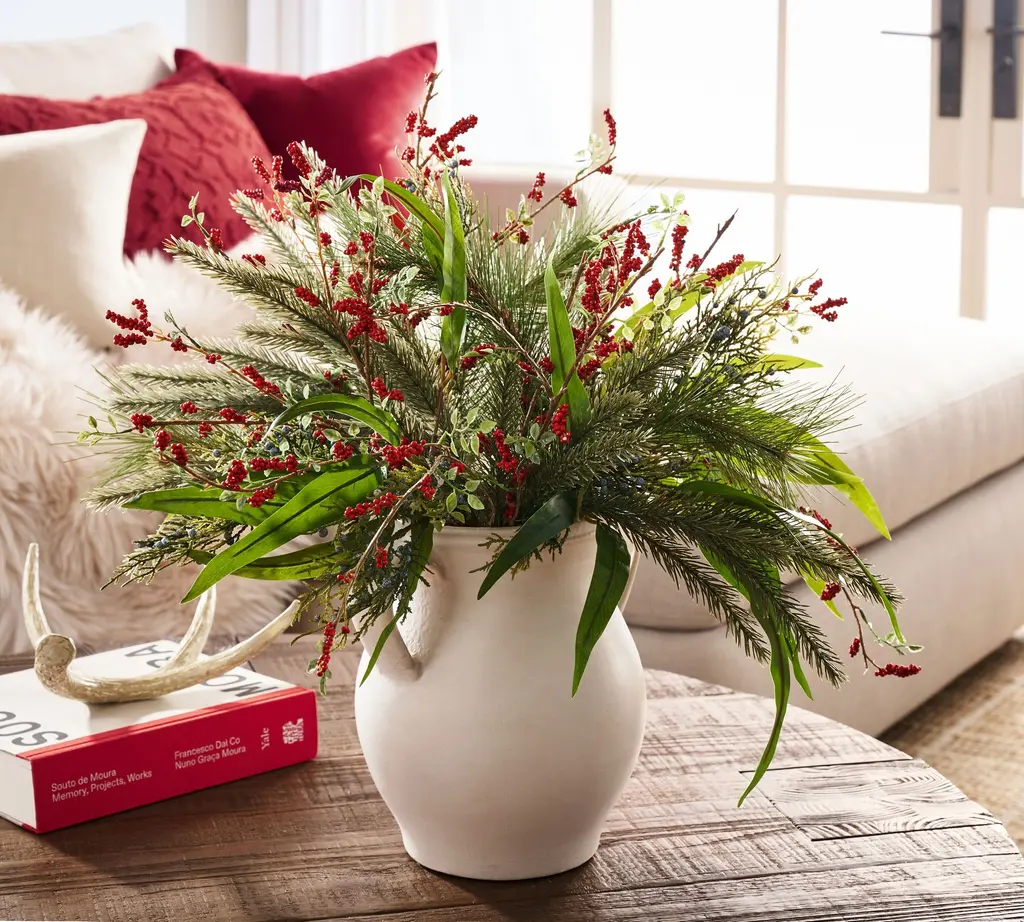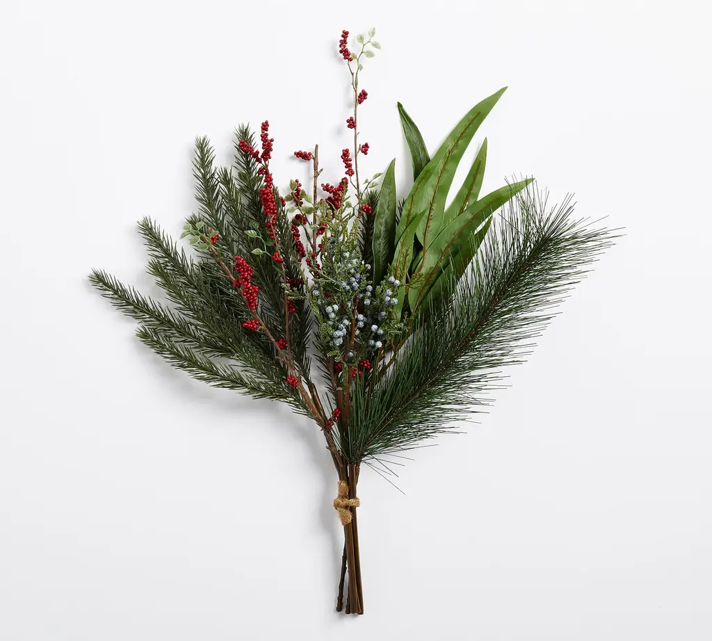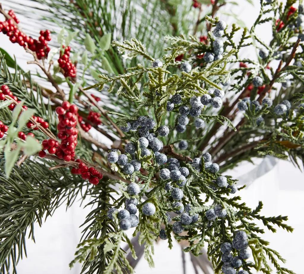 Bring the evergreen beauty of the forest into your home for the holidays with this bundle of faux sprigs and festive berries. We’ve combined seasonal favorites – pine needles, pepperberry, eucalyptus, and fern – to celebrate nature’s year-round abundance.