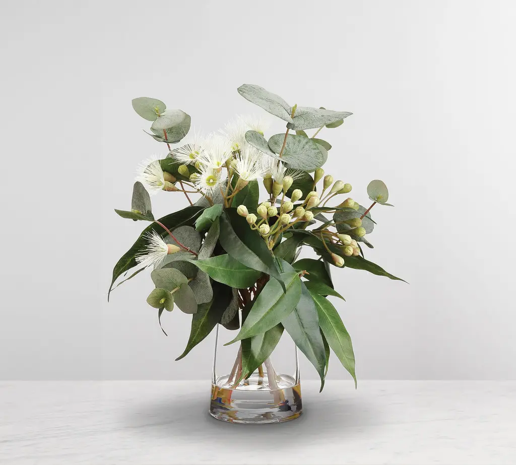 Combining green pine stems and white blooms, our faux botanical bunch creates instant holiday ambiance. Evergreen stems recreate the feathery needles and silvery-sage color of natural pine, studded with actual pinecones for a look that's natural and organic. Created by British floral designer Abigail Ahern, the magnolia stems have all the graceful, naturalistic beauty of the real thing with cream-colored petals with blush centers.