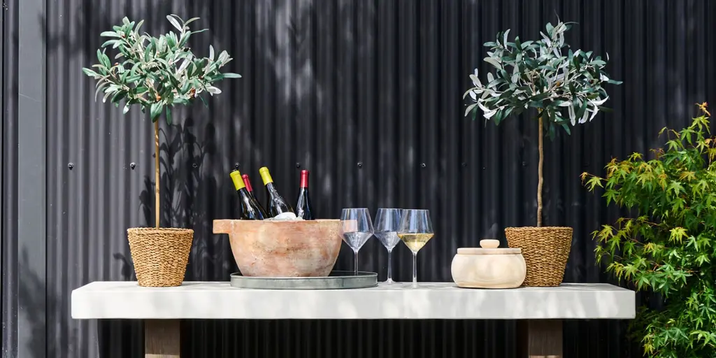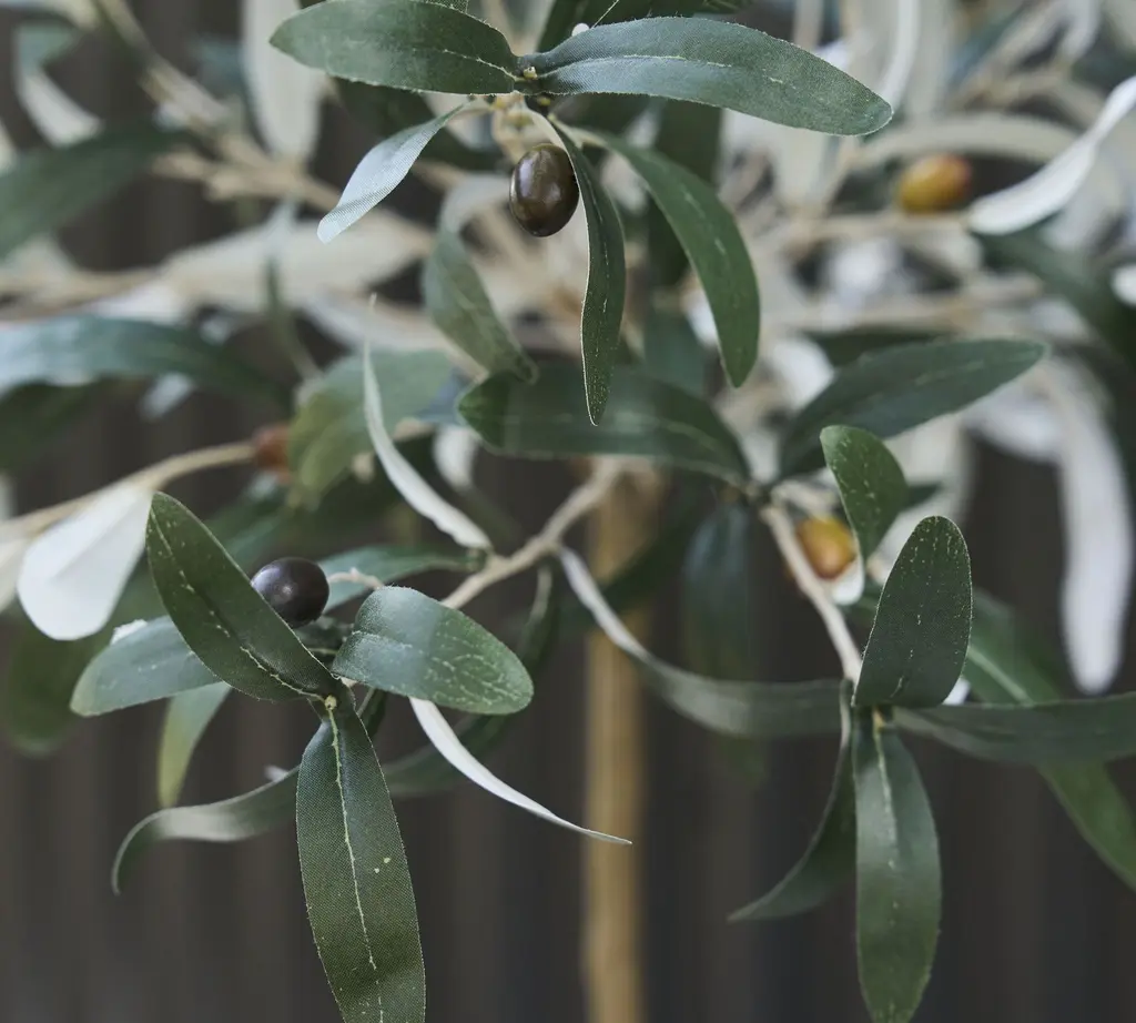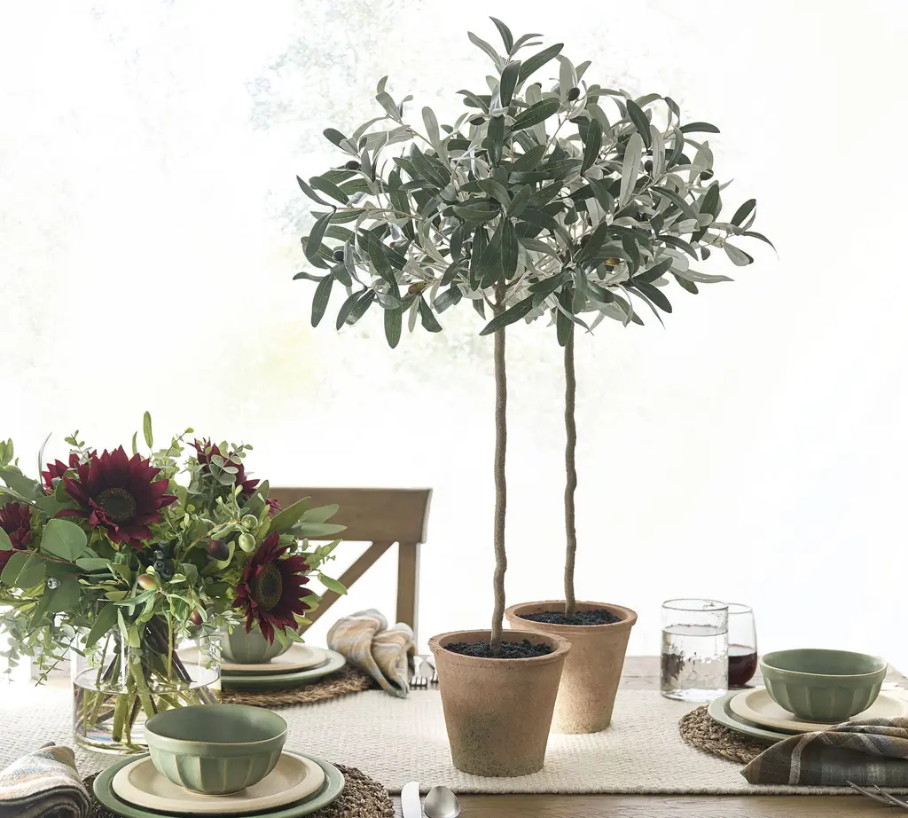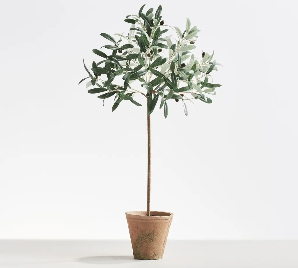 Standing almost 3 feet tall, our olive topiary brings the sun-washed Mediterranean into your home. The faux leaves have deep green tops and subtle silver bottoms and need no watering to stay that way. We've planted its slender trunk in a terracotta pot with a weighted bottom to keep this little tree from tipping over.