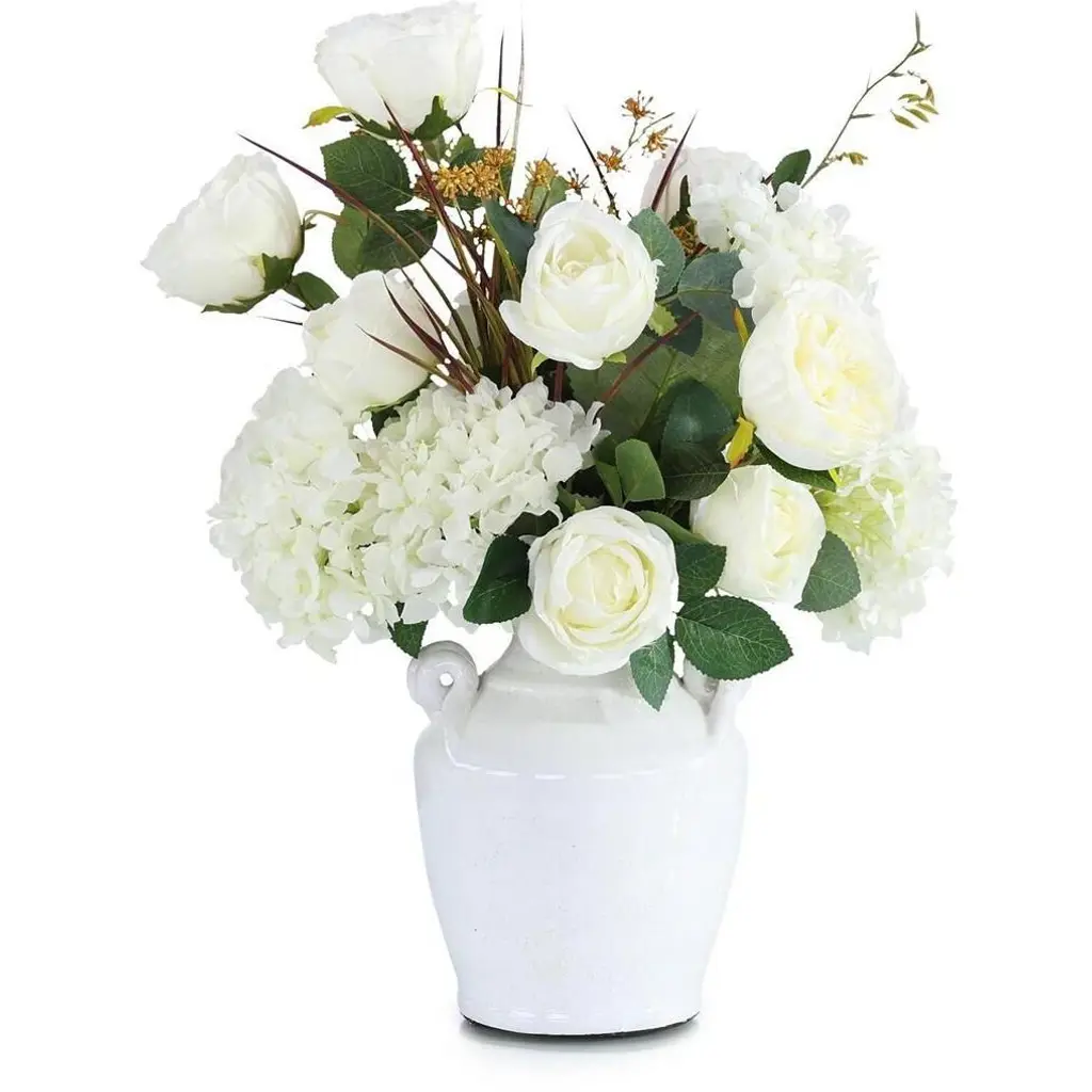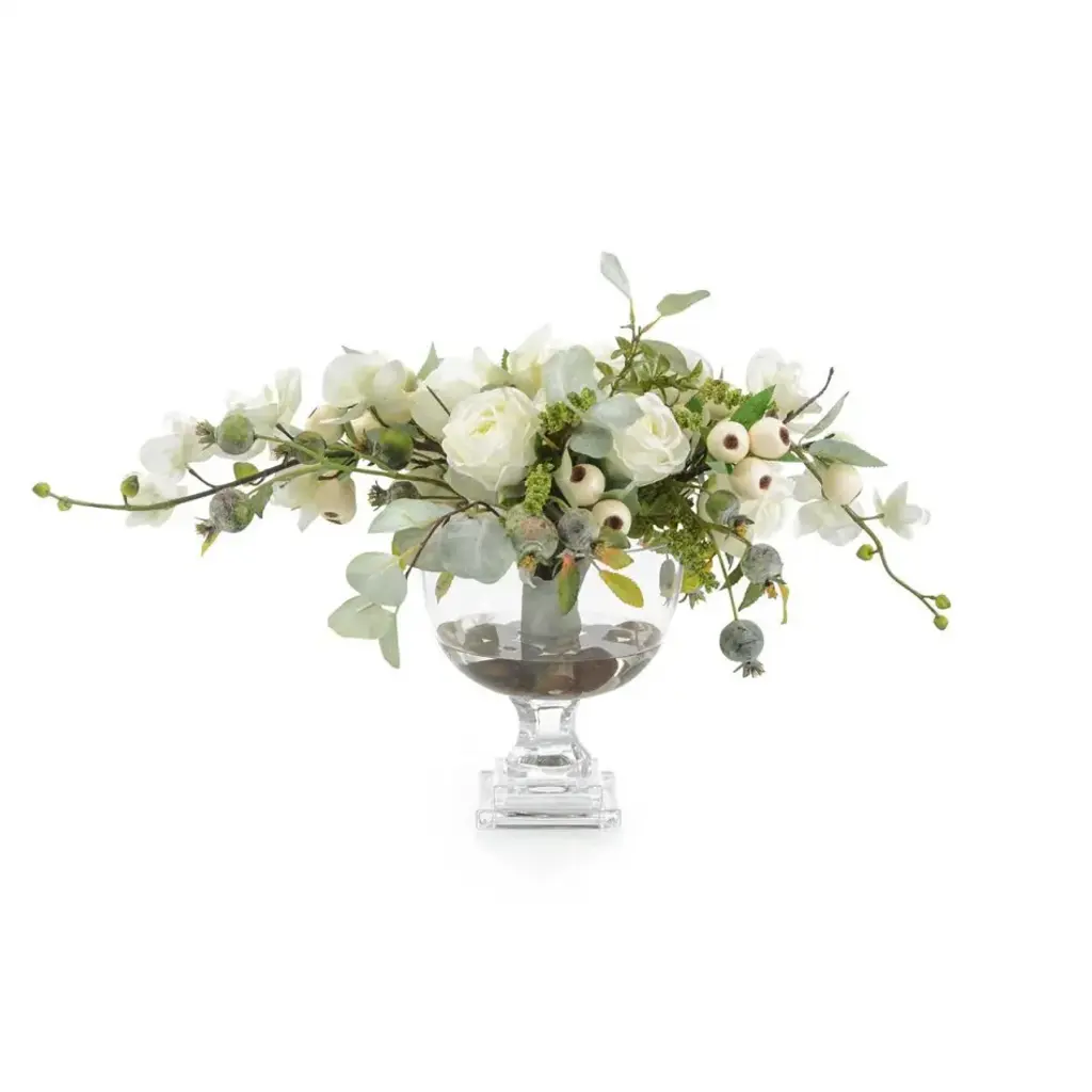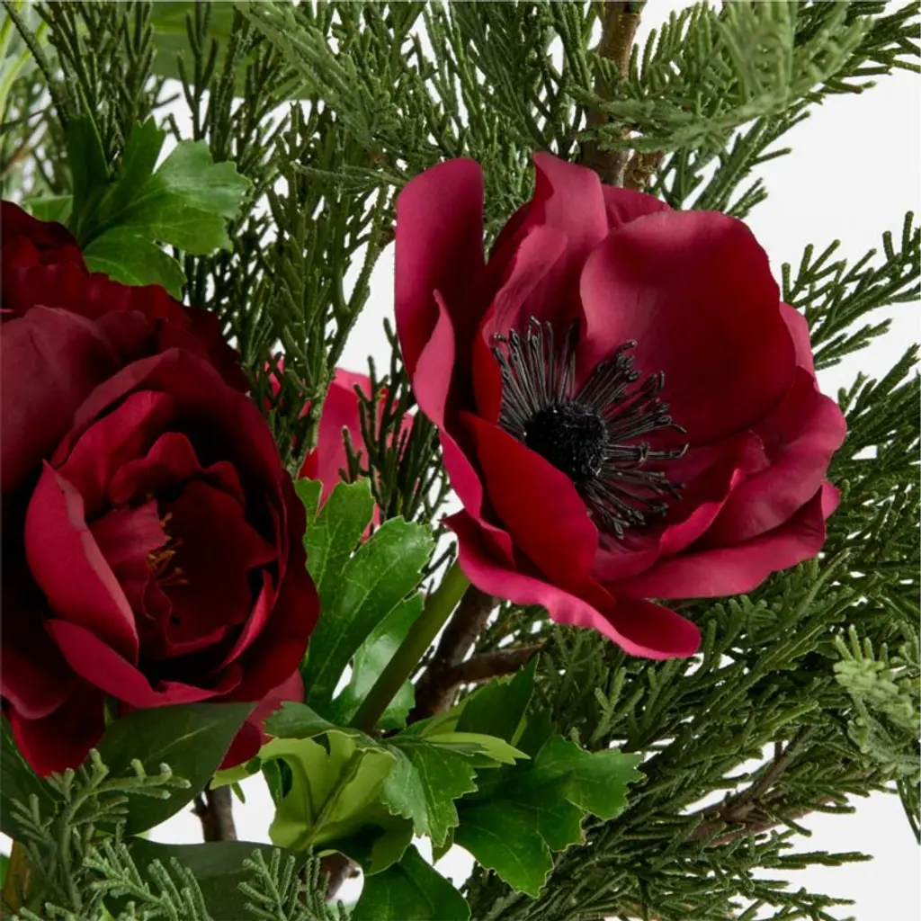 This lush arrangement gathers faux botanicals in red and green for a nature-inspired take on the classic Christmas palette. Designed by British floral designer Abigail Ahern, the Real Touch bunches of red anemone and peonies feature incredibly realistic texture and softness in true-to-life colors. Gorgeous faux cypress stems complement with flat sprays of dark green foliage. Display together in one impressive bouquet or separate into smaller bunches for fresh, seasonal color throughout the home.