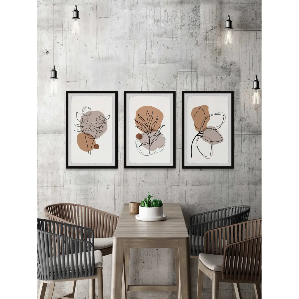Ideal for bohemian chic and mid-century modern spaces, this trio of drawing prints features a geometrical, abstract take on floral arrangements, rendered in a neutral color scheme. Proudly printed in the USA, this piece is printed on high quality archive paper and professionally hand-framed. With wall-mounting hooks included, this artful accent is ready to hang up as soon as it reaches your front door. • Top quality Giclee print on high resolution Archive Paper • Hand cut deckled edges • High quality durable non-warping frame • Finished under shatter resistant plexiglass • Arrives ready to hang • Includes a certificate of authenticity • Printed in the USA