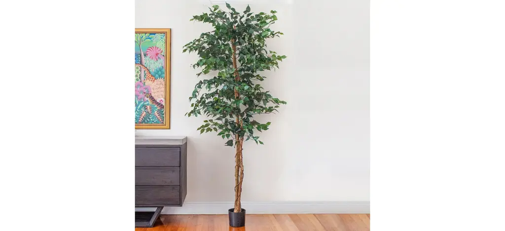 Unlike the real ficus tree (which is finicky and practically leafless in almost any home light conditions), our ficus artificial tree is eternally verdant and deep green with 1260 individual leaves on several sturdy branches. Measuring seven feet in height, this wonderful reproduction ficus would look lovely in a picture window, home entranceway, or even the office.