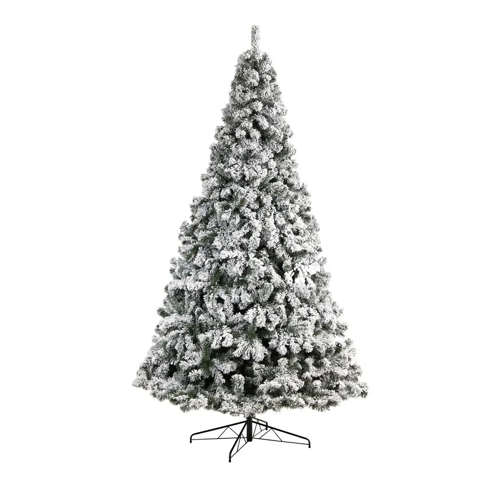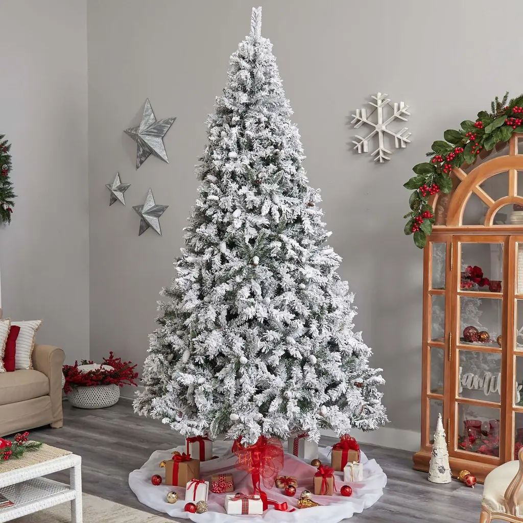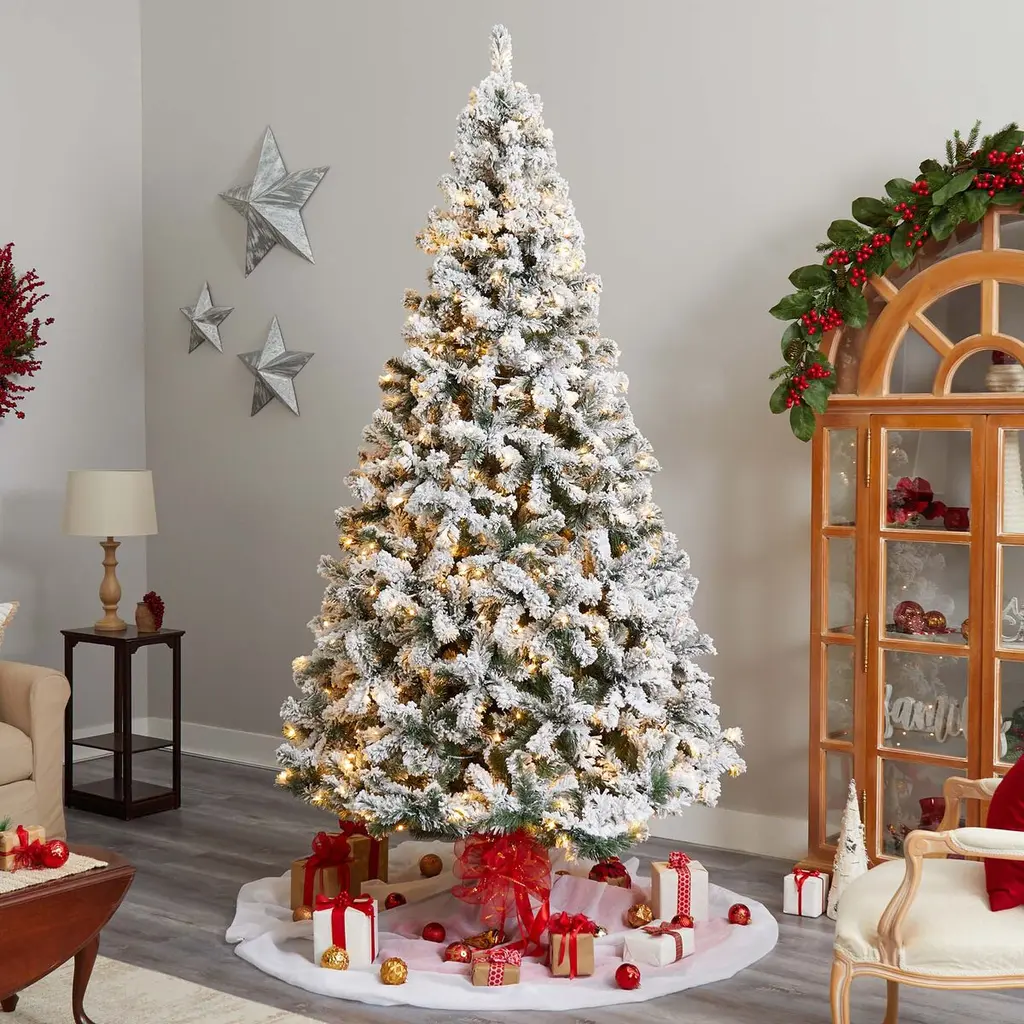 Every Christmas is a white one with this faux fir tree. Ten feet tall in its metal stand and 68 inches in diameter, the flocked tree has 1,680 bendable branch tips prestrung with 800 white LED lights to complement your ornaments.