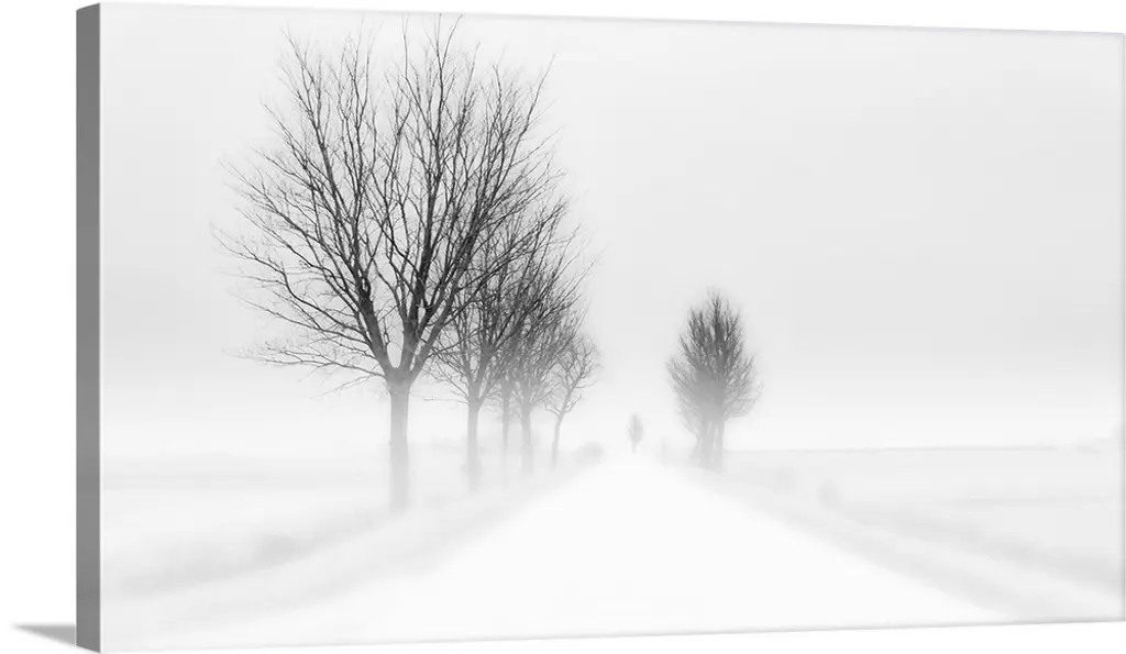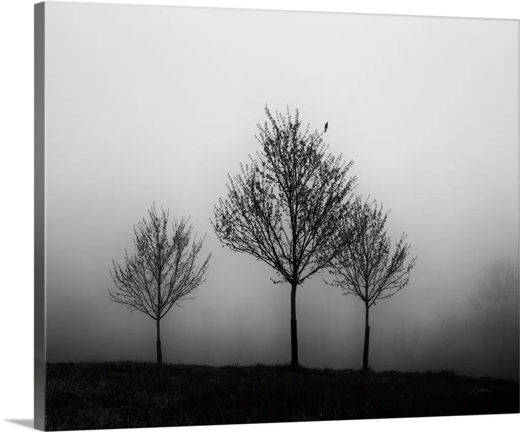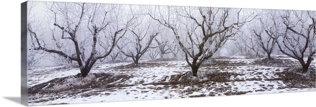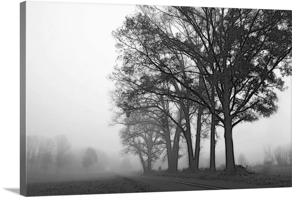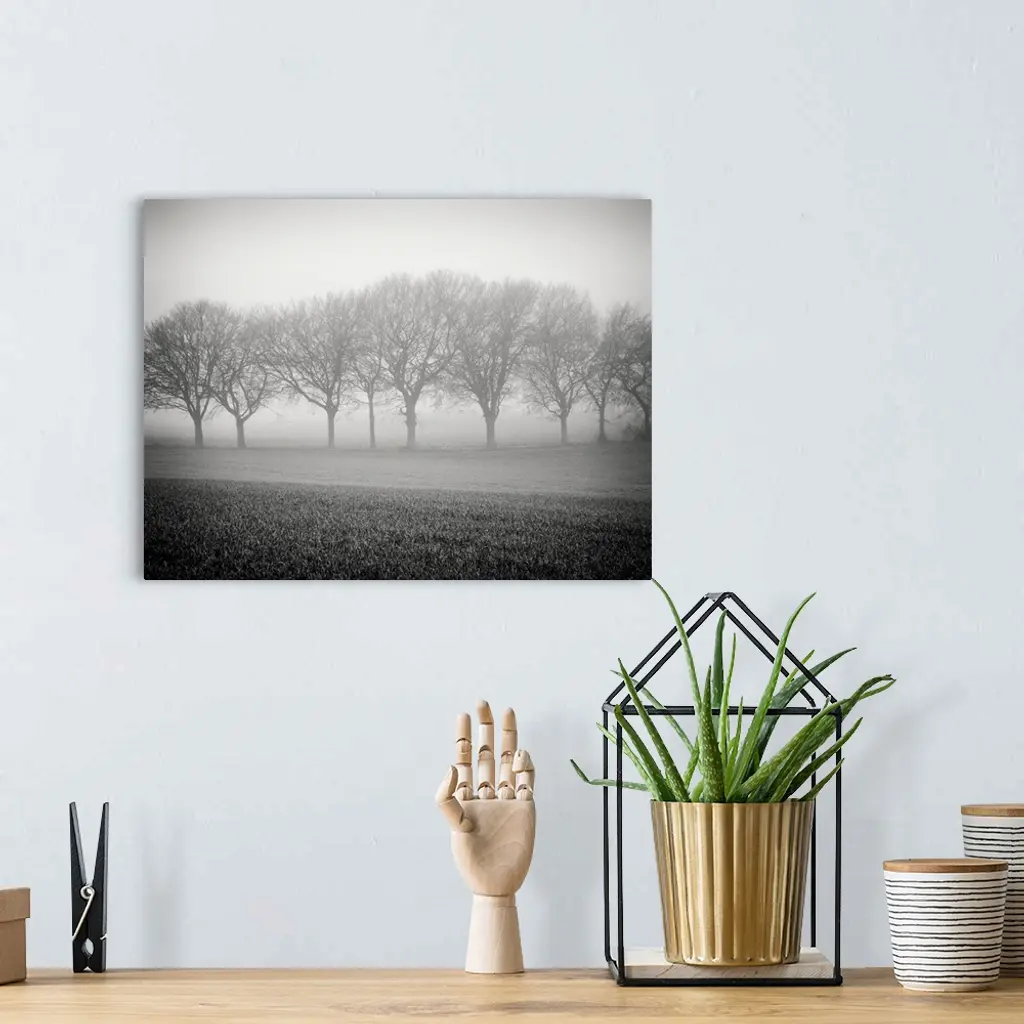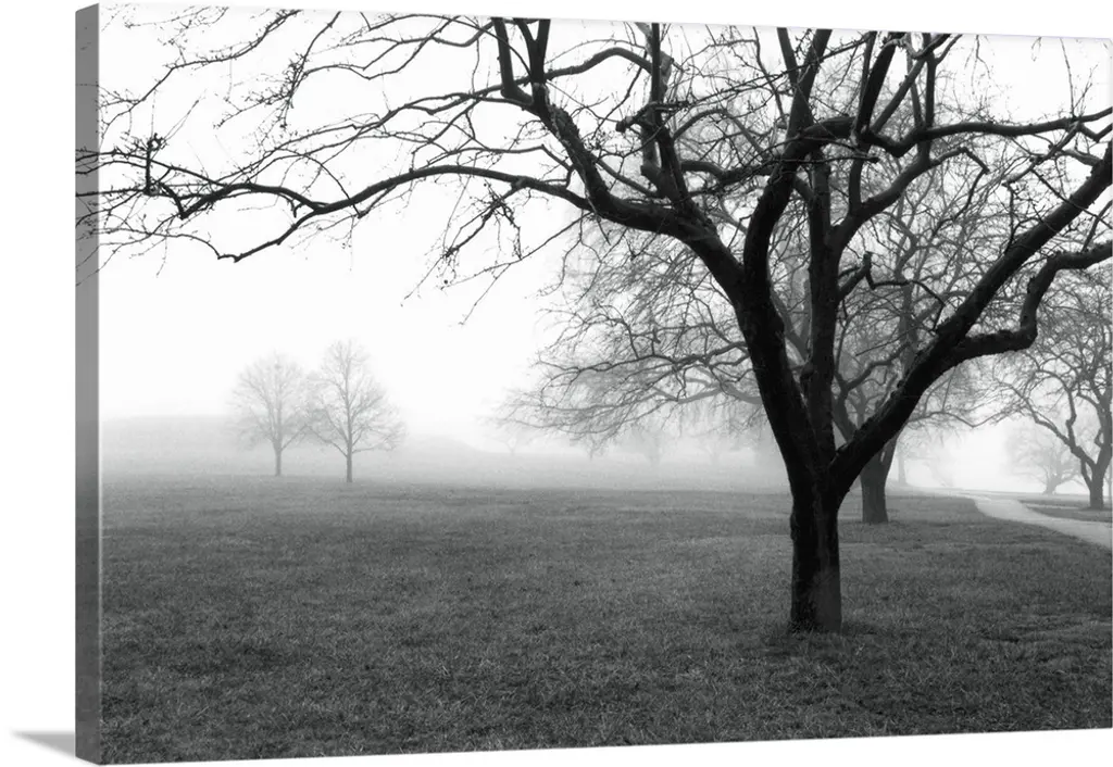 Foggy landscape scene with trees with bare branches