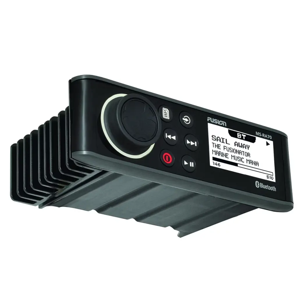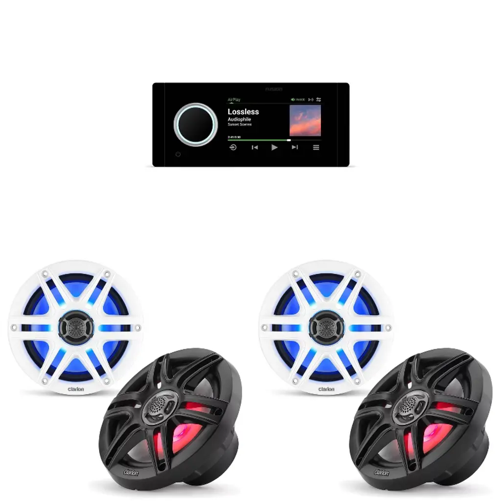 This bundle includes the Fusion Entertainment MS-RA70 Marine Entertainment System with Bluetooth and 2x Kicker KM65 6.5-Inch Marine Coaxial Speakers with 3/4-Inch Tweeters. The Fusion MS-RA70 marine stereo is designed with the latest marine technologies, fitting seamlessly into standard DIN sized non-marinized stereo spaces without reconfiguration. Enjoy 200W peak power, AM/FM tuner with RDS, multiple audio zones, iPod/iPhone compatibility, and IPX7 water resistance. The sleek design allows for flush or flat mounting options with dimensions of 188mm x 60mm x 23.5mm. The Kicker KM65 speakers deliver loud, clear sound with UV-treated components for durability. Featuring a 4-Ohm voice coil, 3/4-Inch titanium tweeter, Santoprene surrounds, UV-treated polypropylene woofer, and rustproof stainless-steel hardware. With a peak power handling of 195 watts, continuous power handling of 65 watts RMS, and ASTM standards compliance, these speakers are built to withstand marine conditions. Get superior sound quality and durability on the water with this premium marine audio bundle.