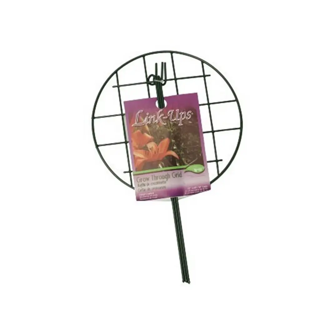 Measures 24-inch length by 16-inch width. This Garden Zone 16 in. Gro-Thru Plant Support is made of PVC-coated steel for durability. The dark green coating blends into the background to allow the beauty of the plant to show through. Made of steel for long-lasting use in various types of weather.