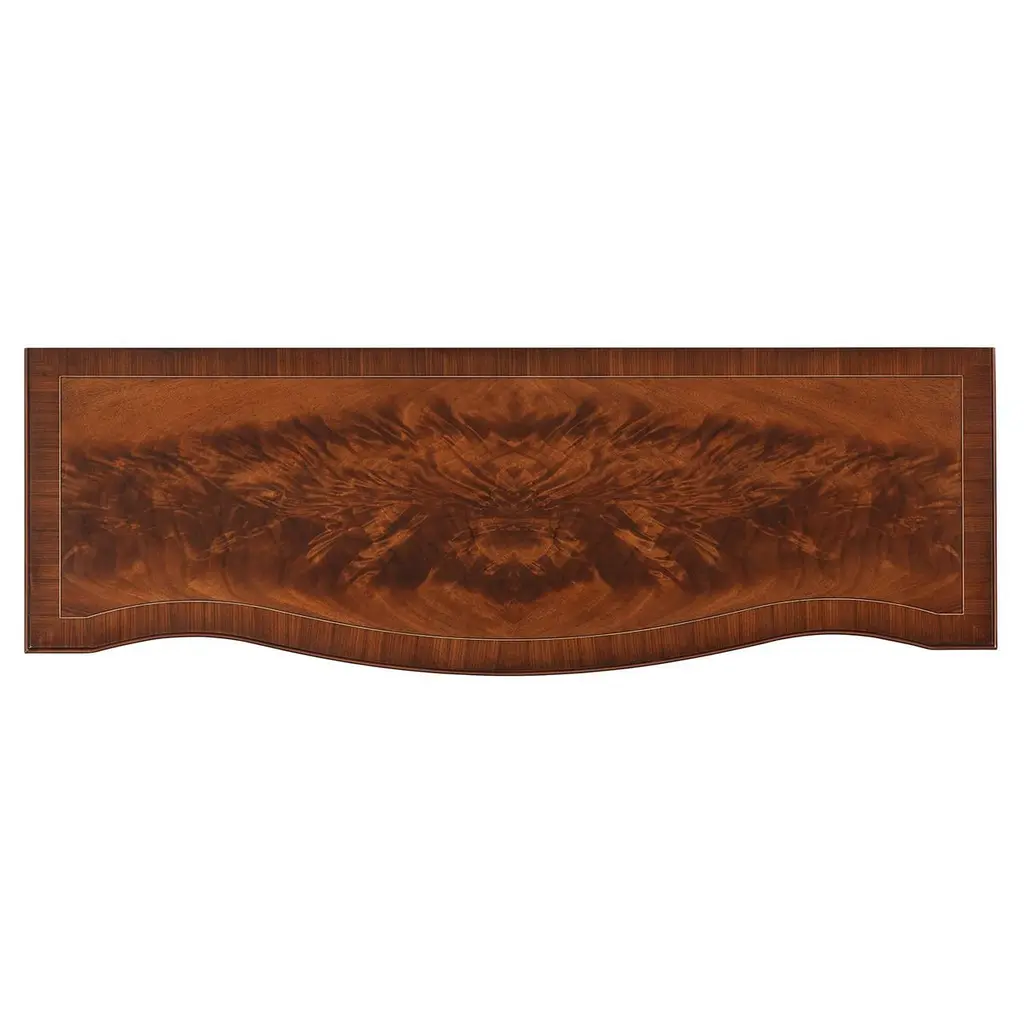 A fine George III style flame mahogany and morado banded side cabinet with fine double stringing throughout, the serpentine top with a parquetry edge above two panel inlaid drawers with floral brass handles, above two paneled doors enclosing an adjustable shelf, flanked by satinwood faux fluted inlaid columns, on a serpentine plinth base.Dimensions: 50.5" W x 17" D x 34" H.