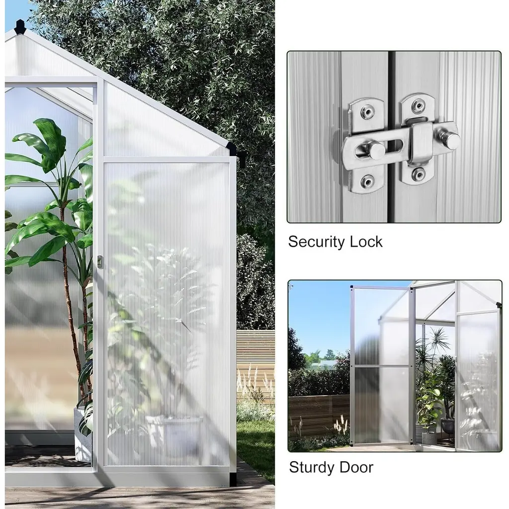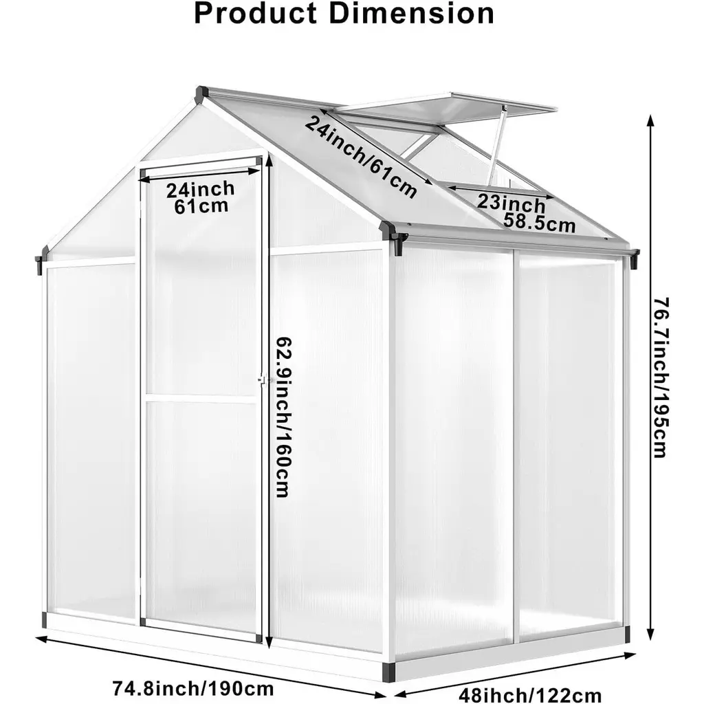 High-Quality Material: Our greenhouse is constructed with a durable, rust-proof aluminum frame and light-transmitting polycarbonate (PC) boards. This combination provides excellent protection against UV rays (99.99% UV protection) while maintaining warmth, creating an ideal growing environment for your plants. Outdoor Heavy-Duty Greenhouse: Designed for outdoor use, this greenhouse protects your plants from cold, wind, rain, and wildlife. Whether starting seedlings or growing tropical plants, the polycarbonate greenhouse kits ensure your plants thrive year-round, no matter the weather conditions. Efficient Roof Vents: The hinged roof vents allow for effective air circulation inside the greenhouse. By enabling excess heat and humidity to dissipate, these vents help maintain optimal growing conditions, promoting healthier plant growth and preventing overheating. Integrated Gutter System: The integrated gutter system effectively drains and collects water, ensuring reliable performance even during rainy days. This feature facilitates efficient drainage and allows for water recycling, promoting eco-friendly gardening practices. Quick Installation Structure: Our greenhouse utilizes a rivet structure and sliding panel assembly system to minimize installation time. The included installation instructions make it easy for individuals with limited free time to set up the greenhouse quickly and efficiently, allowing for more time to enjoy gardening.