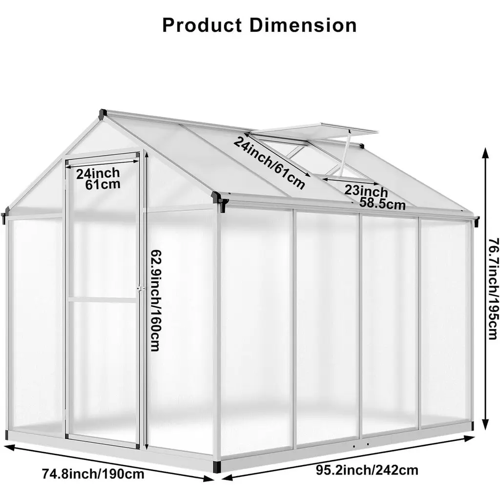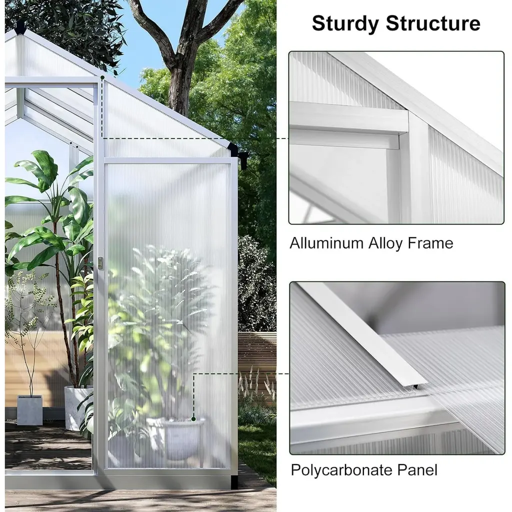 High-Quality Material: Our greenhouse is constructed with a durable, rust-proof aluminum frame and light-transmitting polycarbonate (PC) boards. This combination provides excellent protection against UV rays (99.99% UV protection) while maintaining warmth, creating an ideal growing environment for your plants. Outdoor Heavy-Duty Greenhouse: Designed for outdoor use, this greenhouse protects your plants from cold, wind, rain, and wildlife. Whether starting seedlings or growing tropical plants, the polycarbonate greenhouse kits ensure your plants thrive year-round, no matter the weather conditions. Efficient Roof Vents: The hinged roof vents allow for effective air circulation inside the greenhouse. By enabling excess heat and humidity to dissipate, these vents help maintain optimal growing conditions, promoting healthier plant growth and preventing overheating. Integrated Gutter System: The integrated gutter system effectively drains and collects water, ensuring reliable performance even during rainy days. This feature facilitates efficient drainage and allows for water recycling, promoting eco-friendly gardening practices. Quick Installation Structure: Our greenhouse utilizes a rivet structure and sliding panel assembly system to minimize installation time. The included installation instructions make it easy for individuals with limited free time to set up the greenhouse quickly and efficiently, allowing for more time to enjoy gardening.