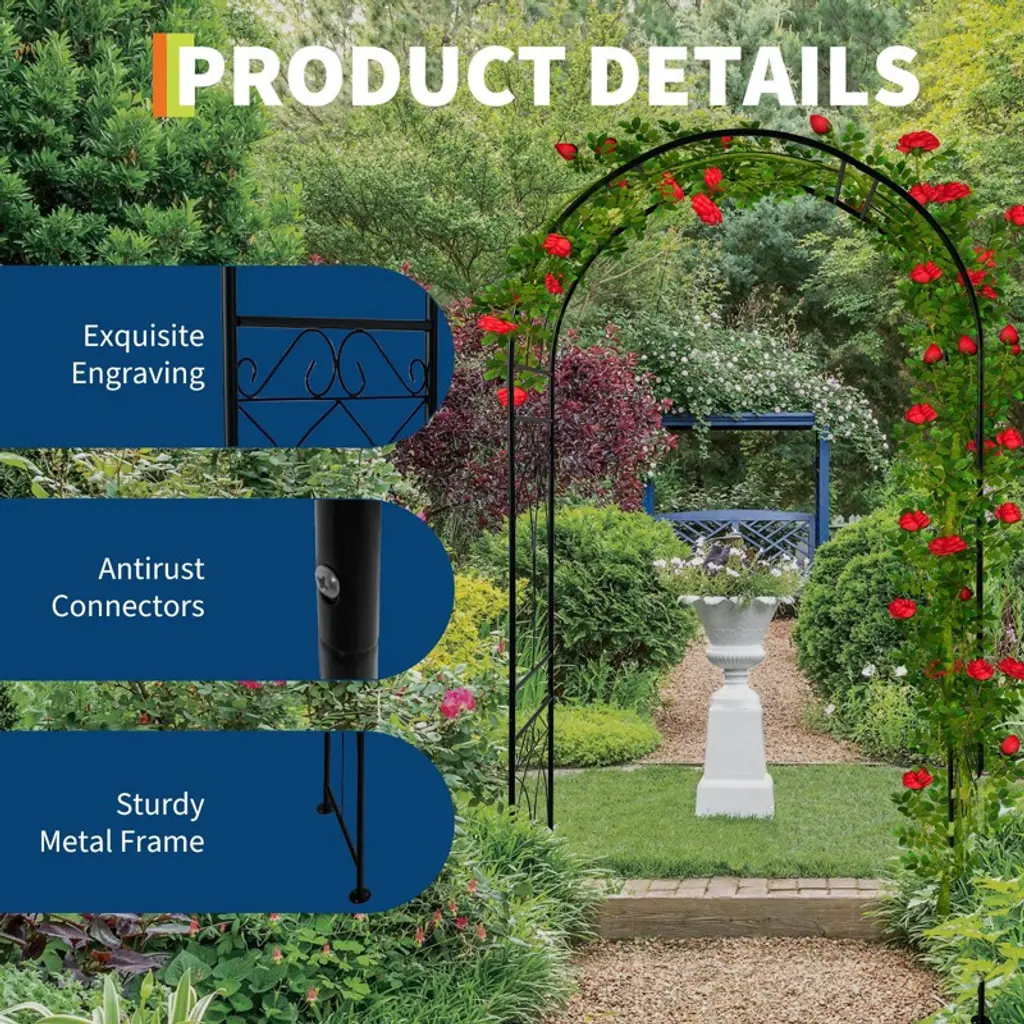 This heavy-duty garden arch combines industrial strength with elegant versatility, crafted from galvanized steel with a weather-resistant powder coating for long-lasting durability. The reinforced base with ground stakes ensures stability for climbing roses, vines, and clematis, while its classic arched design transforms effortlessly into a stunning event backdrop for weddings, parties, and photo sessions. Pre-drilled components allow for quick 15-minute assembly (no tools required) with 12 ground spikes, making it perfect for patios, gardens, and terraces. Whether showcasing blooming plants or decorated with lights and tulle, this multi-functional arch adds natural charm and sophistication to any outdoor space.