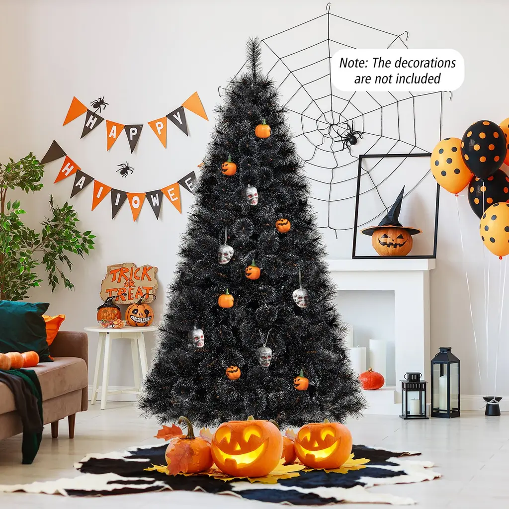 Get Ready to Enchant Your Guests and Create a Magical Holiday Atmosphere! Our exquisite pre-lit Christmas tree is adorned with 362/572 dense branch tips with all-black foliage, adding a touch of sophistication and contemporary elegance to any space. And it boasts a unique blend of frosted pine needles and PVC leaves with different shapes and textures, looking more natural and vivid. Besides, it is pre-strung with 210/320 bright LED lights in a crisp cool white hue, which beautifully accent the tree's foliage. Besides, with hinges that connect the branches and trunk and a pre-assembled screw that secure the trunk and base, setting up this tree is a breeze.Features:Adopts attractive black leaves, embrace the dark and mysterious vibes Features 2 types of leaves with different shapes and textures, more realistic Pre-decorated with cool white LED lights, add a touch of contemporary eleganceColor: Black Material: PVC, Metal Tree Height: 6 ft/ 7 ft Tree Width: 3 ft/3.5 ft Diameter of Stand: 18''/20'' Number of Branch Tips: 362/572 Number of LED Lights: 210/320 Number of Sections: 3/3 Net Weight: 13 lbs/20 lbs Package Includes: 1 x Halloween Tree 2 x Pairs of Gloves 1 x User Guide