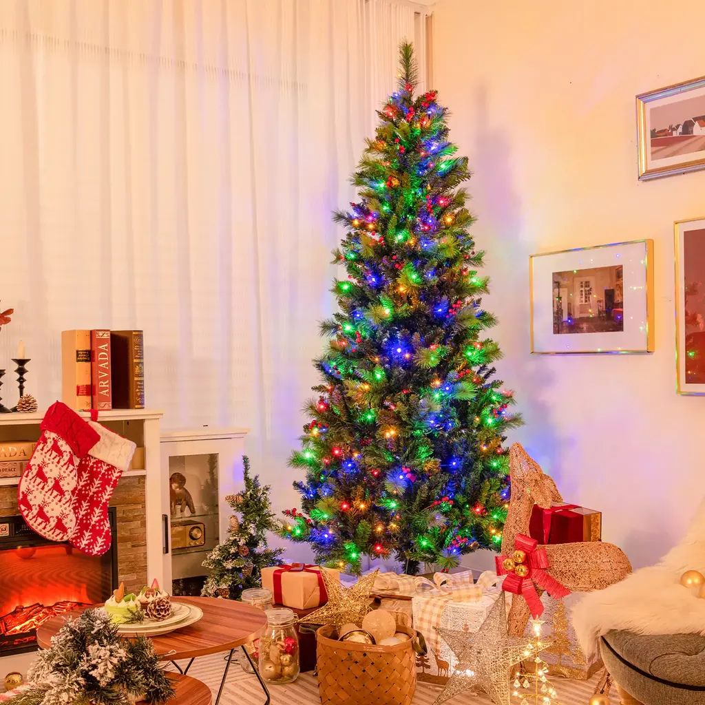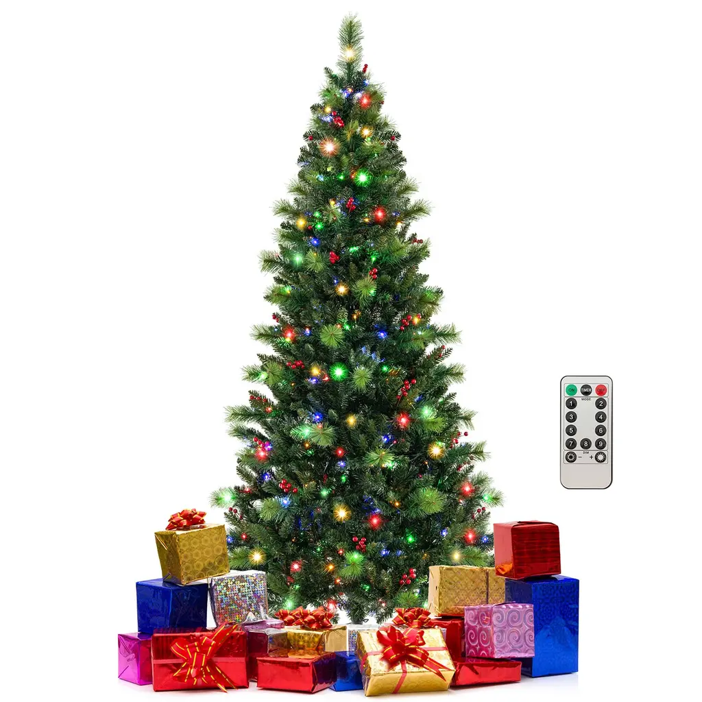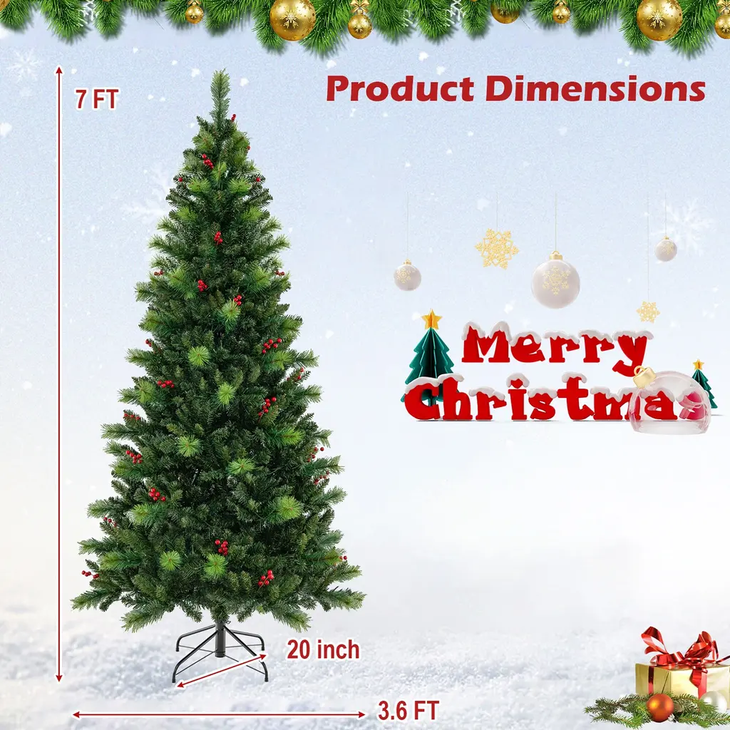 Wish You a Happy and Warm Festival Time with Our Luxurious Christmas Tree! Experience the enchantment of the holiday season with our stunning pre-lit Christmas tree. Designed with 2 types of leaves (pine needles and PVC leaves) with different shapes, and adorned with charming red berries, this tree exudes a natural beauty. More than that, it comes with 400 color-changeable LED lights and offers 9 wonderful lighting modes, therefore you can choose different modes to fit different moods or occasions. Besides, there exist 4 levels of lighting brightness and timer function for you to choose from.Features:Features 974 dense branch tips, look realistic and vivid from far to near Decorated with 2 types of leaves and vivid red berries, bring a touch of nature The LED lights emit warm-white and colorful lighting, creating a magical festival atmosphereColor: Green Material: PVC, Metal Tree Height: 7 ft Tree Width: 3.6 ft Diameter of the Metal Stand: 20'' Number of Branch Tips: 974 Number of LED Lights: 400 Clusters of Red Berries: 36 Number of Sections: 3 Net Weight: 23 lbs Package Includes: 1 x Pre-Lit Christmas Tree 2 x Pairs of Gloves 1 x User's Manual