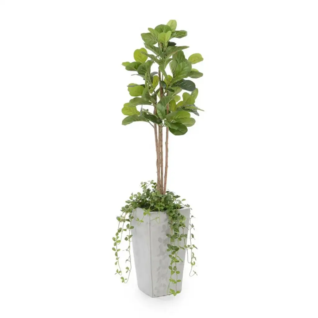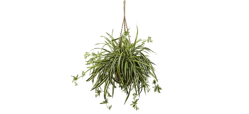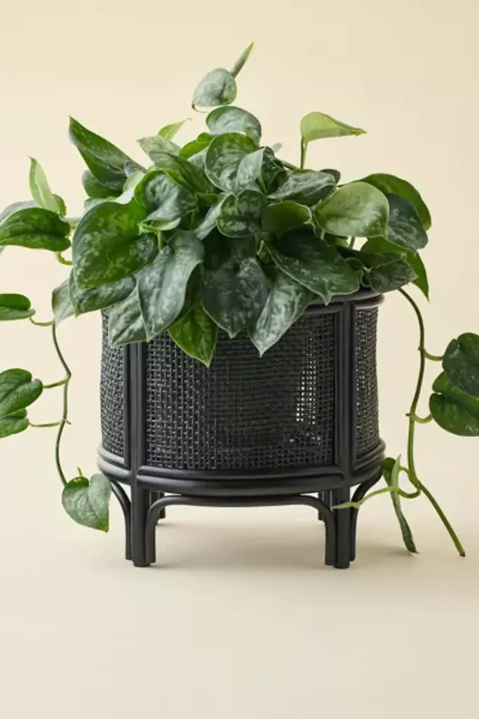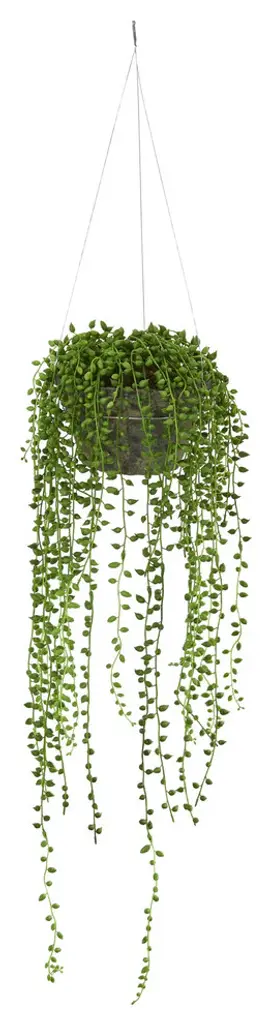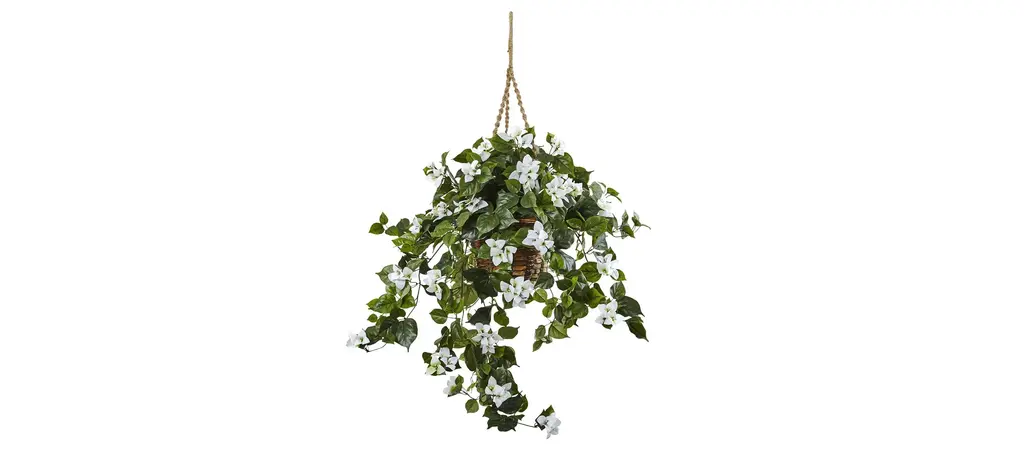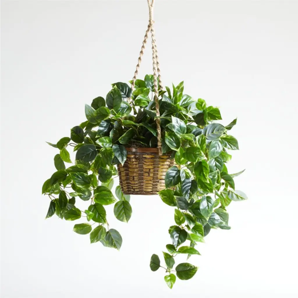 We've made this trailing vine so realistic you might be tempted to water it. Replicating the heart-shaped leaves and variegated color of the pothos plant, this spill of lifelike greenery is "potted" with Spanish moss in a lovely wicker hanging basket. Wire lets you individually shape the leaves to enhance the illusion of a verdant pothos plant. Made of UV-resistant materials, the faux plant can be hung indoors and out, keeping its fresh color for years to come.