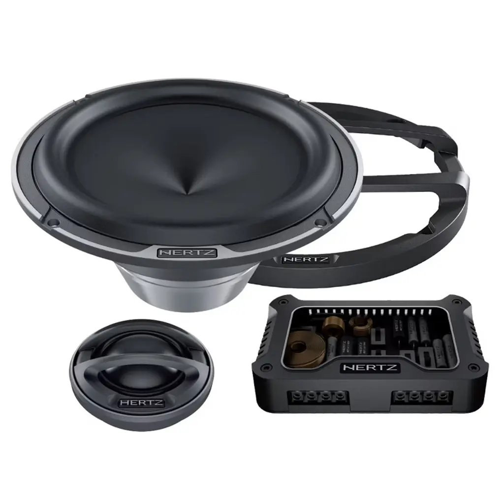 The Hertz MLK 1650.3 Legend car audio speakers system is a two way kit dedicated to purists , aiming at achieving maximum timbre consistency combined with very high dynamics and extremely extended frequency response. Through a solidly built switch, the MLCX 2 TW.3 crossover provides the ability to realize a bi-amplified system, that is, to connect two amplifiers, or anyway two separate channels, to the crossover, so making it possible to drive woofer and tweeter separately. The significant power increase with this configuration highlights all the features of the MLK 1650.3 Legend system, with all the advantages coming from the multi-amplification. Besides, thanks to the Mid-Contour and Hi-Countor controls, dedicated to the management of woofer cut-off frequency and tweeter cut-off frequency respectively, the cross-point can be varied. Through each of these two “Countor” controls, featuring a two-position selector, the system frequency response can be fine-tuned, adjusting it according to the different acoustics of the cars and the different speaker placements and, most of all, the listener can achieve thieir favourite sound. Features - • Tetolon Fiber dome optimized with FEA simulations for lower distortion and improved dispersion in high frequency range. • Exponential V-cone® with optimized geometry for utmost linearity and dispersion at mid frequency range. • Bi-amplification available, selectable through appropriate hi-current rating switch with hi-current carrying capability. Specifications - • Power Handling: 300W Peak • Impedance: 4 Ohms • Frequency Response: 40 ÷ 28kHz