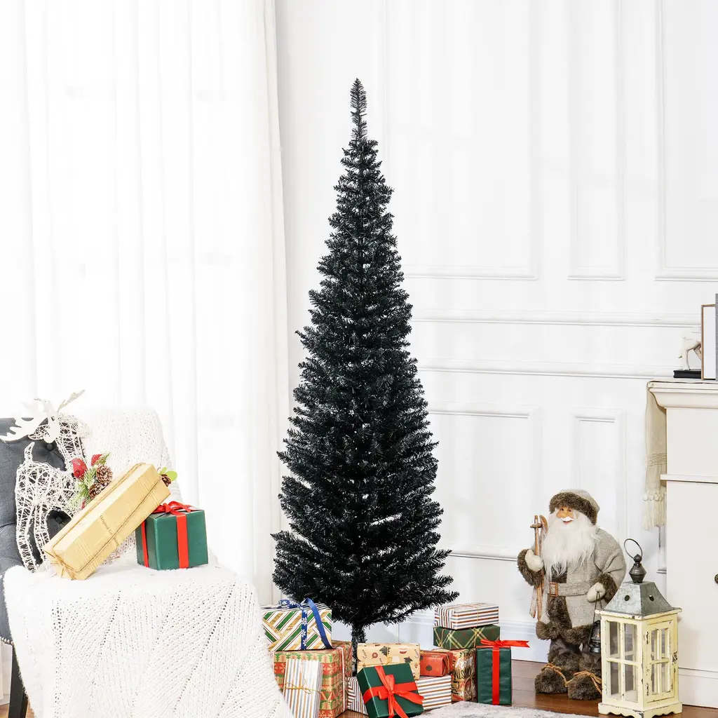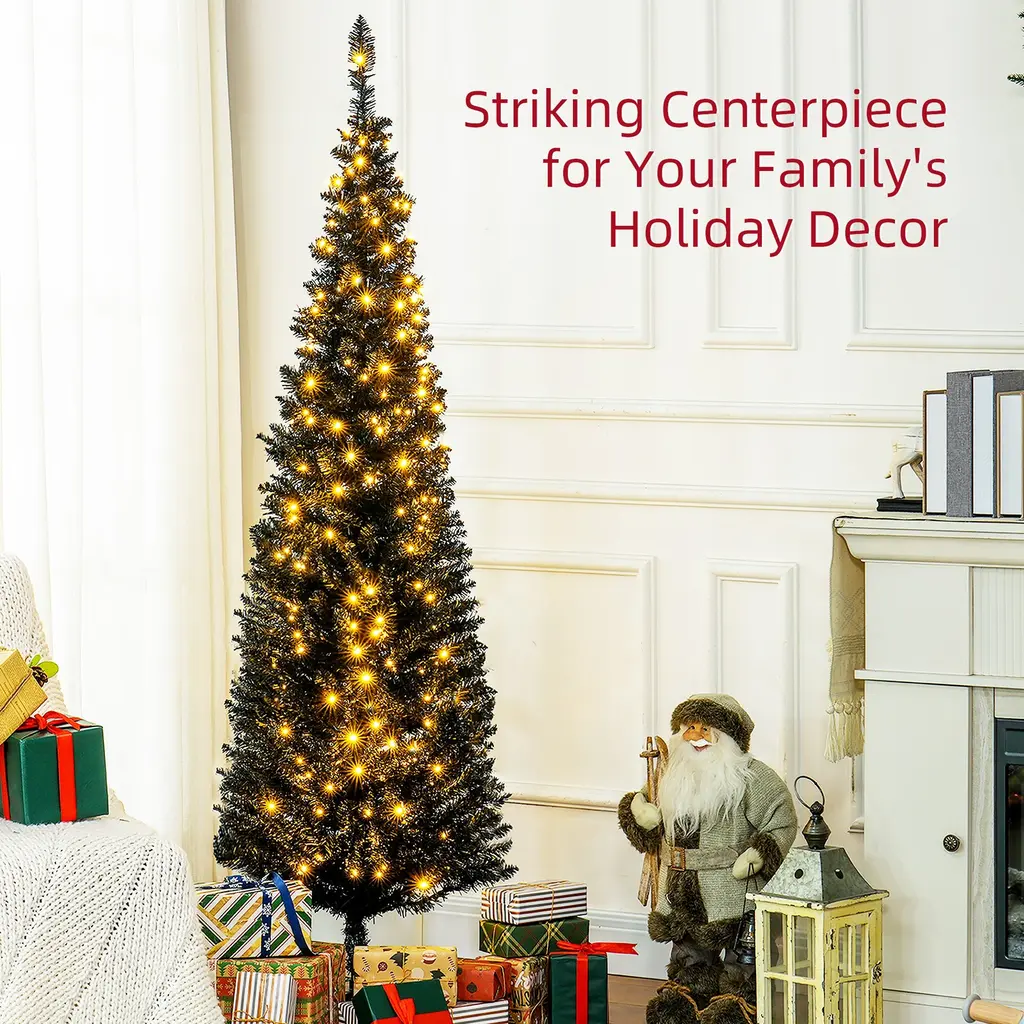 Homcom 6' Tall Pre-Lit Slim Noble Fir Artificial Christmas Tree With Realistic Branches, 200 Warm White Led Lights And 390 Tips - Black