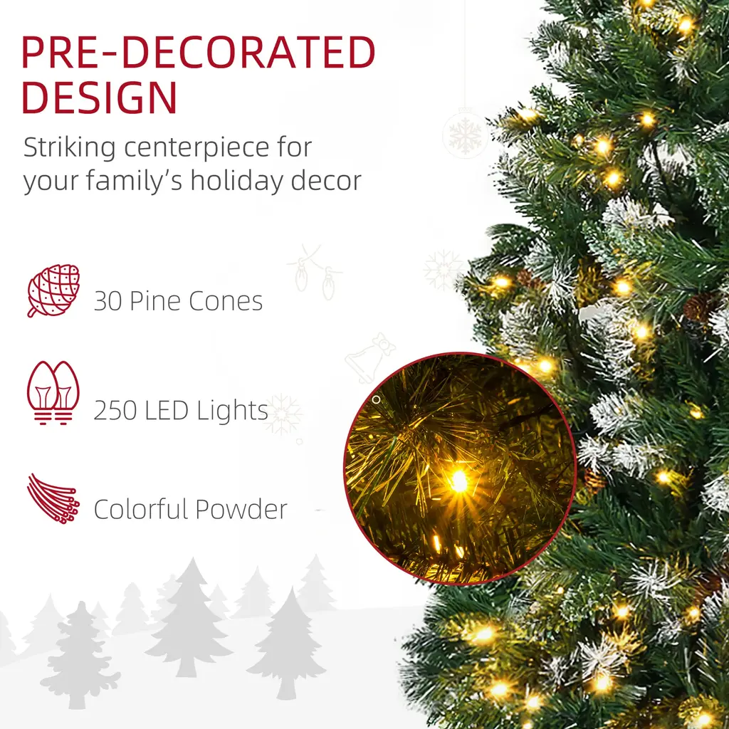 Descriptions:HOMCOM's skinny Christmas tree selection gets you all the ambience the holiday brings without any of the mess the holiday brings. Our HOMCOM lighted Christmas tree will help take some of the hassle out of the holiday.Features:● 6ft tall, lush with pinecones that provide a healthy, natural look● Some branches are molded from real branches for realist tree style and without much shaping● The ends are painted white to make them look like snow and creates a winter atmosphere without having to clean up a bunch of mess● Colorful powder on the branches will shine in the warm white LED lights● Slim shape don't take up much floor or table space, suitable for small rooms or a second Christmas tree in an entryway● Hinge construction, section design, branches being opened automatically for quick setup● Flame retardant branches are unlikely to catch fire or cause serious household damage● Sturdy metal base keep the tree uprightSpecification:- Color: Green- Light Color: Warm White- Material: Plastic, Steel- Overall Dimension: Dia. 31.5" x 70.75" H- Tree Height: 6 ft- Cord Length: 6.6 ft- Tip Count: 703- Light Count: 250(LED)- Input: 120 V, 60 Hz- Output: 30 V, 120 mA, 3.6 W- Item Label: 830-732V80GNNote: Only for indoor use, not for outdoorIn order to get a full appearance, please spread out all individual tips to get the best possible look from the tree, suggest you to take 25-40 minutes to shape the tree.