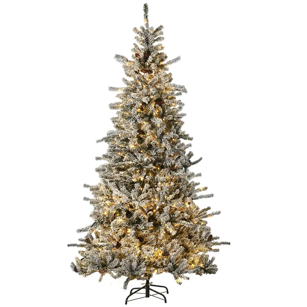 Descriptions:HOMCOM's Christmas tree with lights gets you all the ambience the holiday brings without any of the holiday mess. Spending time together with friends and family is really what Christmas is all about, and your tree is something you shouldn't have to mess with (ugh). Our HOMCOM lighted Christmas tree will help take some of the hassle out of the holiday. Little mess, simple assembly, and impeccable ambience help make your season just a little brighter.Features:● 7.5ft tall, lush with a wide shape that provides a healthy, natural look● Sprayed with artificial snow to add a wintry appearance● Warm white LED lights consume little energy and are cool to touch● Hinge construction, section design, and auto open branches for quick setup● Flame retardant branches and faux snow are unlikely to catch fire or cause serious household damage● Sturdy steel base keeps the tree uprightSpecification:- Color: Green- Light Color: Warm White- Materials: PVC, Steel- Overall Dimensions: Dia. 52.25" x 90.5" H- Tree Height: 7.5ft- Cord Length: 6.6ft- Tip Count: 1566- Pine Cone Count: 80- Light Count: 550(LED)- Input: 120 V, 60 Hz- Output: 30 V, 240 mA, 7.2 W- Item Label: 830-729V81GNNote: Only for indoor use, not for outdoorIn order to get a full appearance, please spread out all individual tips to get the best possible look from the tree. We suggest you take 40-60 minutes to shape the tree.