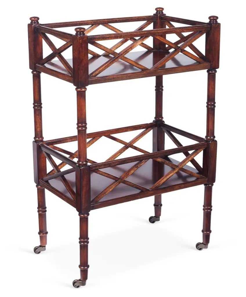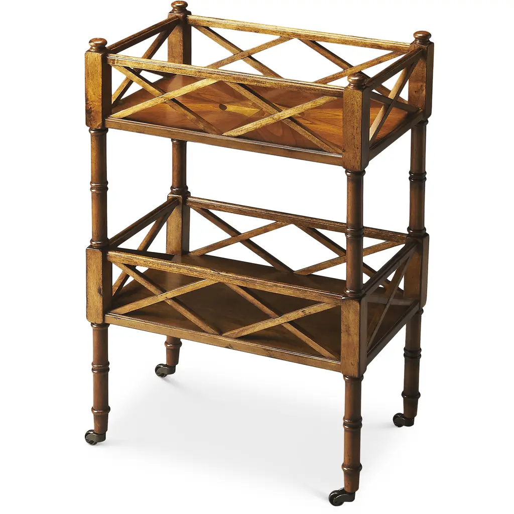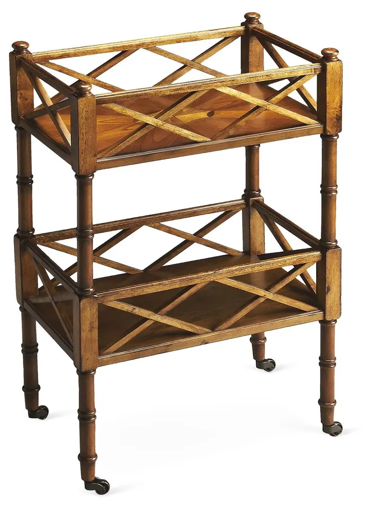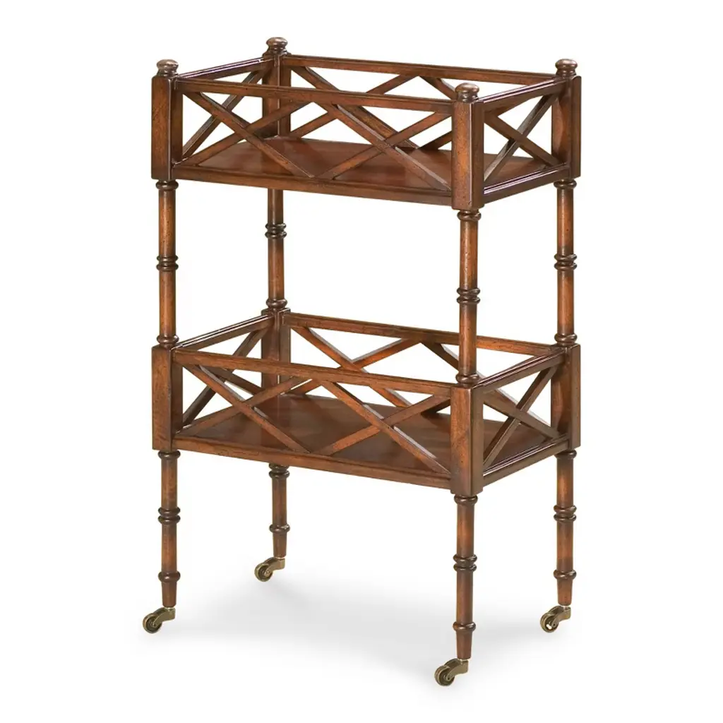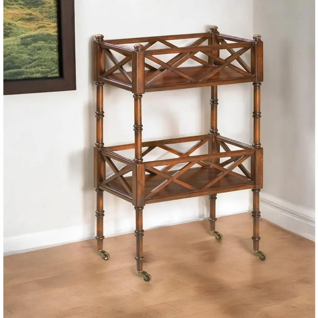 Quintessential in style is the Plantation Cherry Mobile Server table. Crafted from selected hardwood and a matching cherry veneer this server is the perfect addition to any vintage decor. The two shelves have been aesthetically designed to carry any kind of serving. Carved to perfection are the four strong pillars which conclude with brass finished casters for easy movability. 30" x 19" x 12"