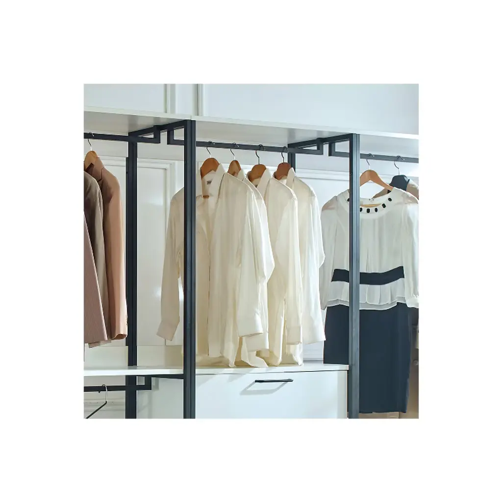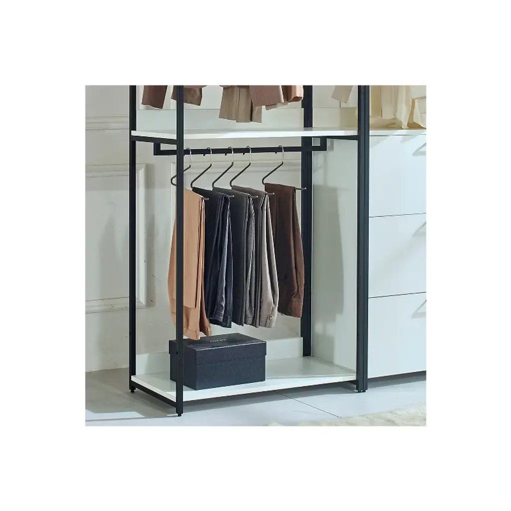The HomeStock Fiona White Freestanding Walk In Closet System offers a stylish and practical solution for organizing your wardrobe. This freestanding design allows for versatile placement within your space, while the combination of a classic white wood appearance and a sleek black metal frame creates a modern aesthetic. Featuring spacious tower units and soft-closing drawers, this modular system provides ample storage for clothing, accessories, and more. The durable construction ensures long-lasting performance, making it an ideal addition to any bedroom or dressing area.