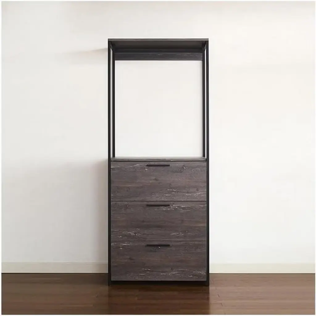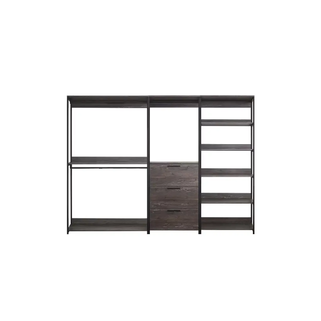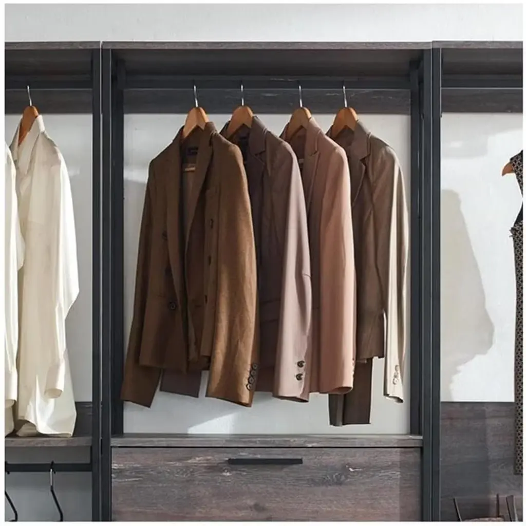 Organize your wardrobe with the HomeStock Monica Walk-In Closet System. This versatile closet organizer allows for customized configuration to meet your specific storage needs. A generously sized drawer offers ample space for storing accessories like handbags and footwear, while the weathered wood finish paired with a sleek black metal frame brings a touch of modern style to your closet space. Enjoy a functional and fashionable solution for keeping your belongings neatly arranged and easily accessible.